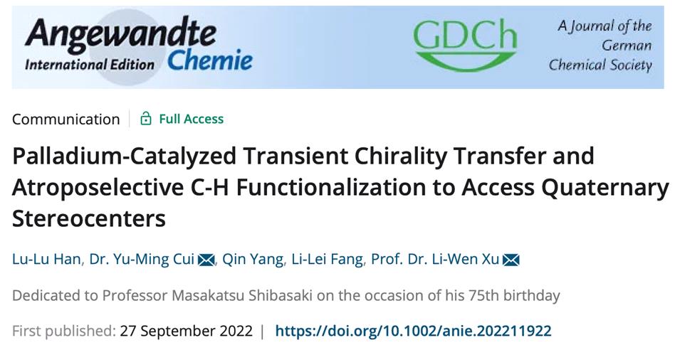 /有机硅化学及材料技术实验室徐利文教授团队在高效构筑全碳取代的季碳立体中心研究方面取得新进展,相关研究以“Palladium-Catalyzed Transient Chirality Transfer and Atroposelective C-H Functionalization to Access Quaternary Stereocenters”为题发表在国际化学领域权威期刊AngewandteChemie International Edition(2021年,IF:16.823)上。