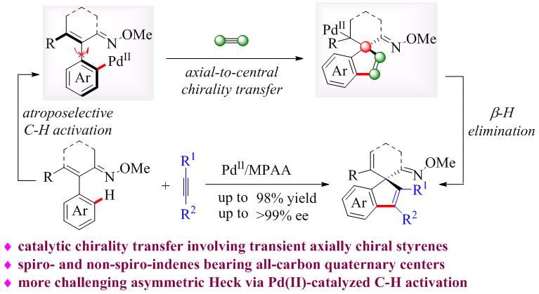 全碳季碳立体中心广泛存在于天然产物、药物和生物活性分子中。然而,在不对称催化合成领域,手性全碳季碳立体中心的高效构筑一直是化学家公认的研究热点同时也是极具挑战性的课题。过去几年,大师兄影视 徐利文研究团队基于去对称化策略及自主创制的手性配体卓有成效地开发出一系列四取代碳及硅手性中心的合成方法(Angew. Chem., Int. Ed.2019, 58, 897;Angew. Chem., Int. Ed. 2019,58, 6747;Angew. Chem. Int. Ed. 2020, 59, 790.)。在诸多构建季碳立体中心的合成方法中,钯催化的不对称Heck偶联反应因具有产率高、对映选择性好等优点而倍受关注。美中不足的是,此类反应通常以预先官能化的卤代烃为原料,导致整个合成路线的原子、步骤经济性较差。最近,徐利文课题组巧妙结合不对称C-H官能化反应和瞬态轴向中心手性转移策略,成功实现了全碳季碳立体中心的构筑。该方法具有操作简单、条件温和、产率高、立体选择性好等特点。这是首例将轴手性苯乙烯结构金属中间体应用到催化手性转移过程的报道,为各种螺环和非螺环茚类功能分子的合成提供了更加简洁高效的策略,同时拓宽了季碳立体中心的构筑方法。