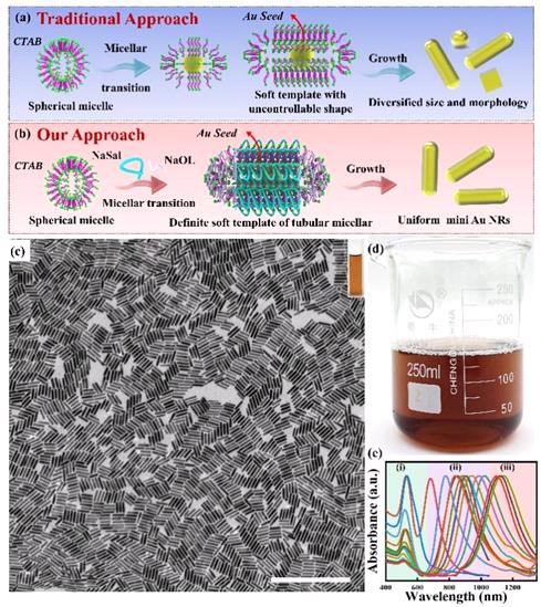 图1传统(a)和我们的(b)方法制备超小纳米金棒的示意图。超小纳米金棒的TEM图(c)和溶液照片(d),长径比为2.70 ~ 7.32,波长可调范围为700 ~ 1147 nm (e)的Au NRs的UV-vis近红外光谱。(c)中的比例尺为500 nm。