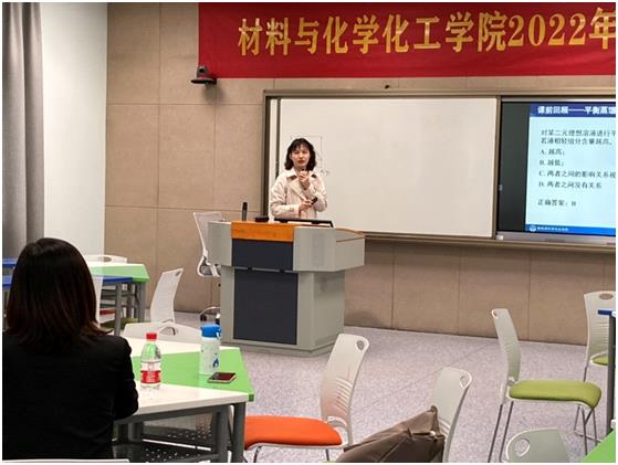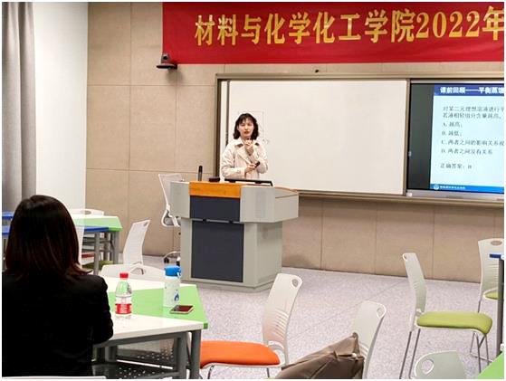比赛现场,精彩纷呈。教师们分别结合教学设计报告,精心选取节段进行现场模拟授课。教师们用激情饱满的状态、深入浅出的语言,将基础化学知识讲解得通俗易懂,做到堂堂有思政,处处有育人。如羊海棠老师向大家展示了先进的信息化手段,智慧教学平台的应用;王安明老师将课程思政元素应用于物理化学教学过程中,通过转变课程教育理念和思维方法、以课程思政要求创新教学方式、由自然科学实现价值引领与哲学思考,促使学生的专业知识与思政理论同向同行。