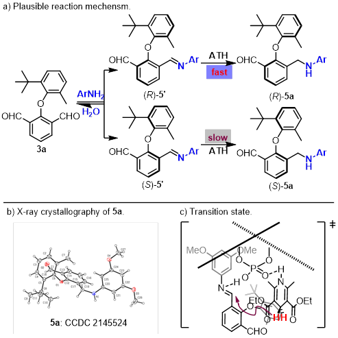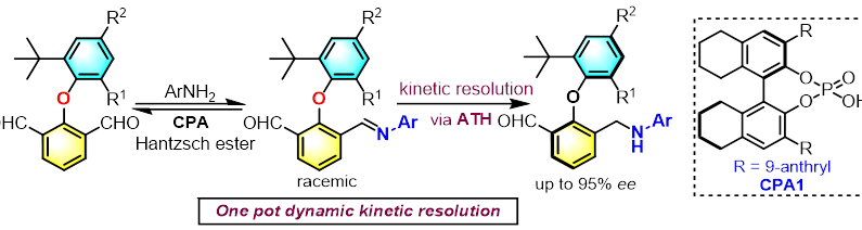 作者对该策略的可能催化机理进行了合理的解释。二醛和苯胺初步形成外消旋的亚胺中间体,R构型的亚胺可以在手性磷酸催化下快速发生氢转移反应得到目标构型的产物。而另一构型S型的亚胺则会发生水解,重新得到二醛。通过亚胺的阻转能垒的DFT计算以及相关控制实验也表明生成的亚胺不会在室温下发生构型的翻转从而证明作者提出的机理的合理性。