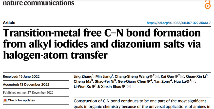 近日,我校大师兄影视 特聘研究员邵欣欣、卢华教授在烷基碘化物的自由基胺化研究上取得最新研究进展,相关成果以题为“Transition-metal free C–N bond formation from alkyl iodides and diazonium salts via halogen-atom transfer”发表于Nature Communications(《自然-通讯》)。