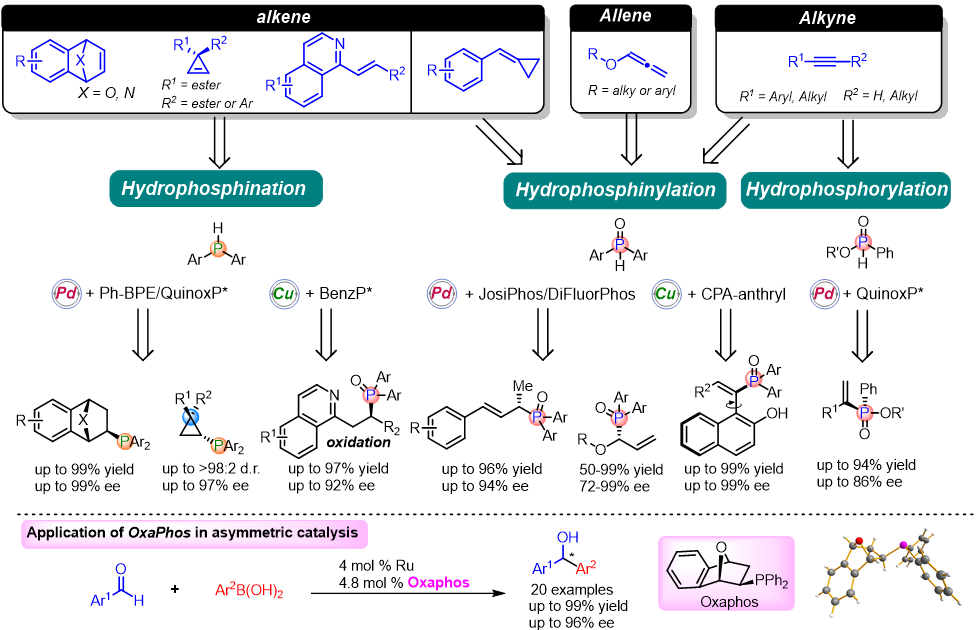 Asymmetric catalysis is a very broad and exciting field. In spite of hundreds of chiral ligands developed, phosphine ligands are keeping their prestigious role as the most powerful and frequently-used ligands. With the exceptionally high demand of chiral phosphine ligand, it is significant to develop efficient methods for construction these chiral organophosphorus compounds. Transition metal-catalyzed asymmetric hydrophosphination is the most direct pathway for the synthesis of chiral phosphine compounds. Recently, our group developed asymmetric hydrophosphination of alkenes, alkynes, allenes and cyclopropenes.1-5 These approaches allowed concise, direct, modular and unprecedented accesses to potentially valuable chiral phosphorus compounds.