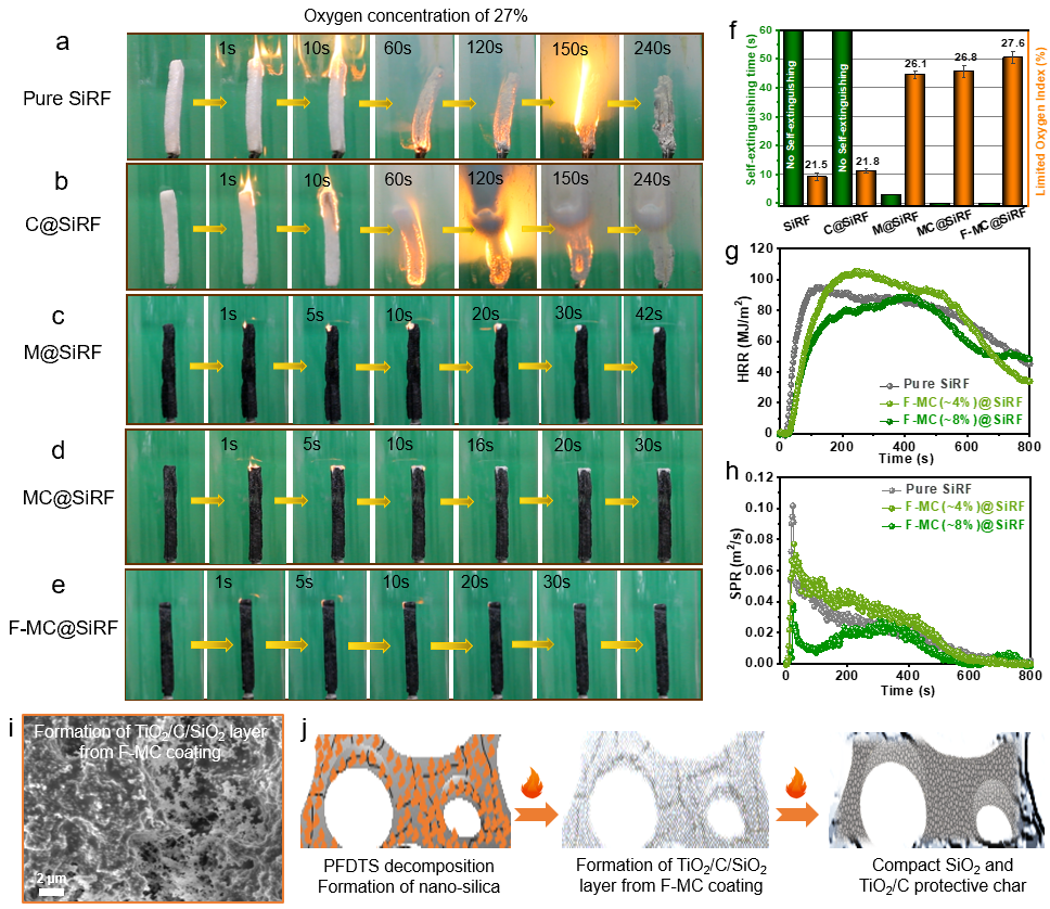 基于以上综合性能,对该泡沫材料的阻燃性能行进研究发现涂层中的MXene二维材料赋予了该泡沫优异的阻燃性(LOI值>27%,烟雾产生率低)。阻燃机理表面:在燃烧过程中,泡沫表面生成了致密的TiO2/C/SiO2保护层。该保护层有效阻隔了火焰进攻,并且降低了烟雾释放,实现优异的阻燃性。除以上性能,该泡沫材料还具有良好的隔热性能和在各种应力模式和复杂环境条件下都具备可靠的应变能力。该工作为制备多功能硅橡胶泡沫提供了一种新颖且简便的方法。
