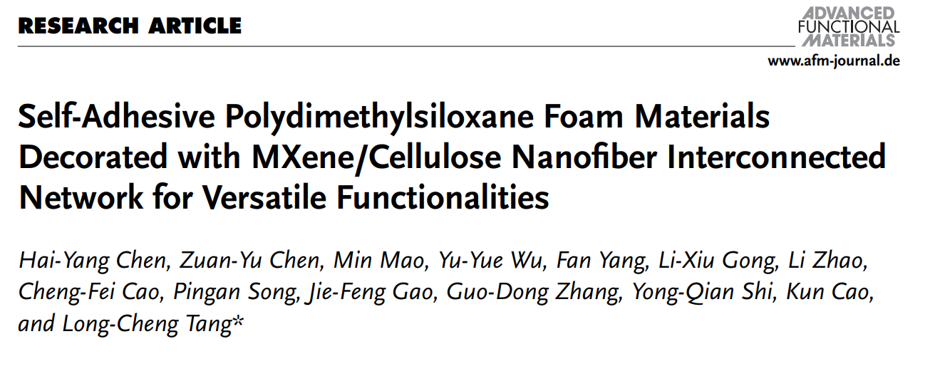 近日,我校大师兄影视 汤龙程教授团队基于有机硅分子交联/发泡反应机制,提出一种自粘型硅橡胶泡沫材料的设计思路,并制备出高性能PDMS泡沫纳米复合材料。该材料具有轻质弹性、绿色阻燃、可调节导电、以及优异的耐高低温和耐水性等特性,在复杂环境智能医疗监测和防火隔热等方面具有良好的银应用前景。相关研究成果以题为“Self-Adhesive Polydimethylsiloxane Foam Materials Decorated with MXene/Cellulose Nanofiber Interconnected Network for Versatile Functionalities”发表于国际材料领域权威期刊Advanced Functional Materials (2023,IF=19)上。