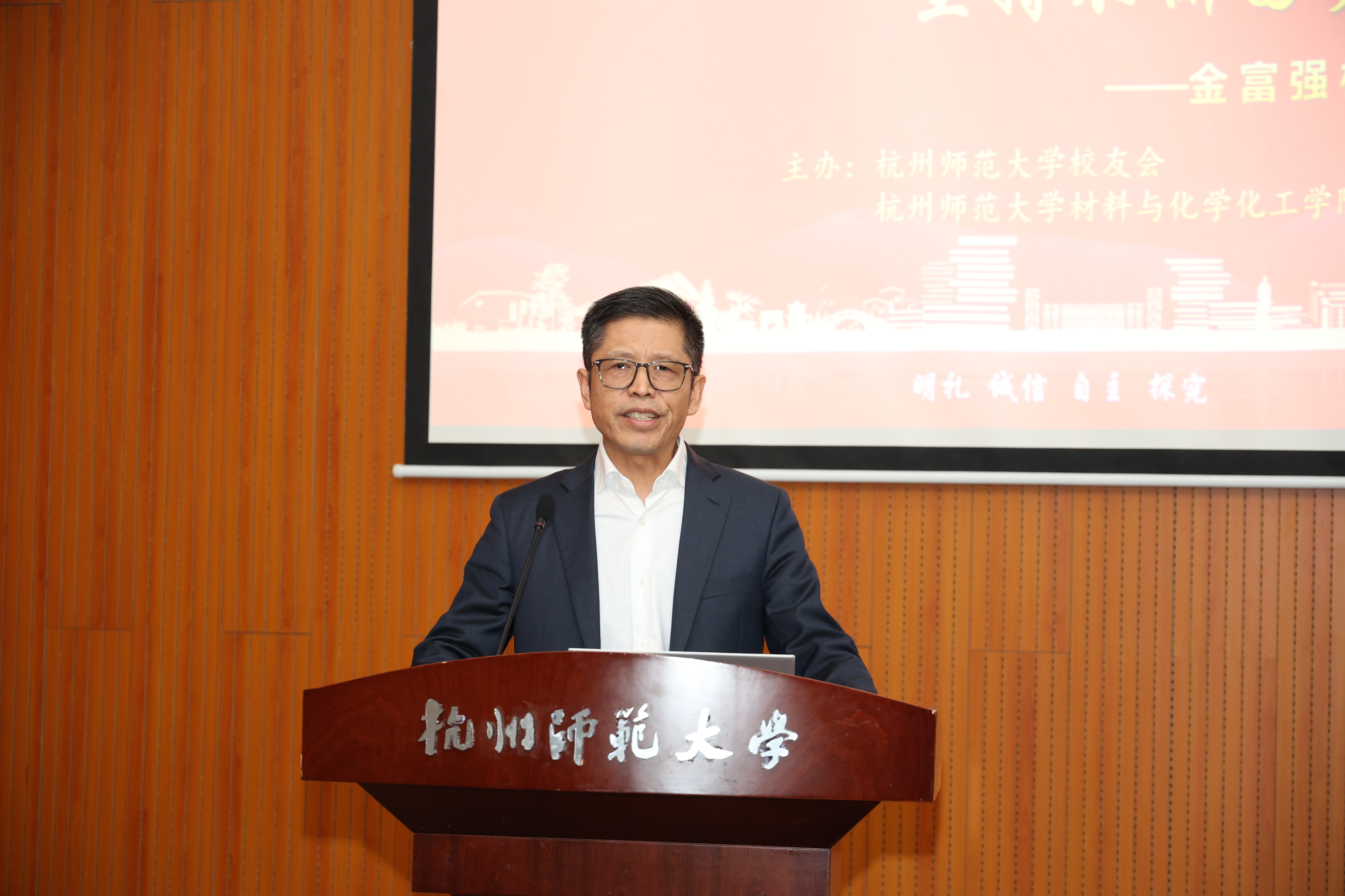 在主题分享环节,金富强结合自己的自身求学和工作经历,对人生经验和感悟作了分享。第一,人生没有平坦路,要接受挑战,坚持不懈,提升自我。“人生不能回头,既然选择了,就要坚定勇敢地走下去!”金富强通过自己在选择创业方面遇到的情况,讲述了自己对人生道路选择的感悟,表达了大好青春之宝贵,坚持不懈之难得,用奋斗擦亮青春的底色。第二,要在社会实践中、在面向社会需求中实现个人发展。金富强分享了自己发现国内外制药工艺的差异而选择回国,解决国内需求的事迹,指出社会实践对于个人发展的重要性。他希望同学们能够凭借青年应有的精气神,在社会实践活动中感知社会,自觉将自己的“小我”融入祖国的“大我”,发现机遇,抓住机遇,服务祖国,奉献人民。第三,要终身学习,不断充实完善自己。金富强强调,学习是全方面的,课本上的知识仅仅是冰山一角,要以有限的书本扩展到无限的社会知识。他表示,学习是我们一生当中永远的主旋律,同学们要培养学习能力和思辨能力,提高自身综合素养。同时,他还为同学们科普了制药工艺的过程,表示制药是一个多学科交叉的行业,并表达了自己对同学们未来职业选择的美好祝愿。