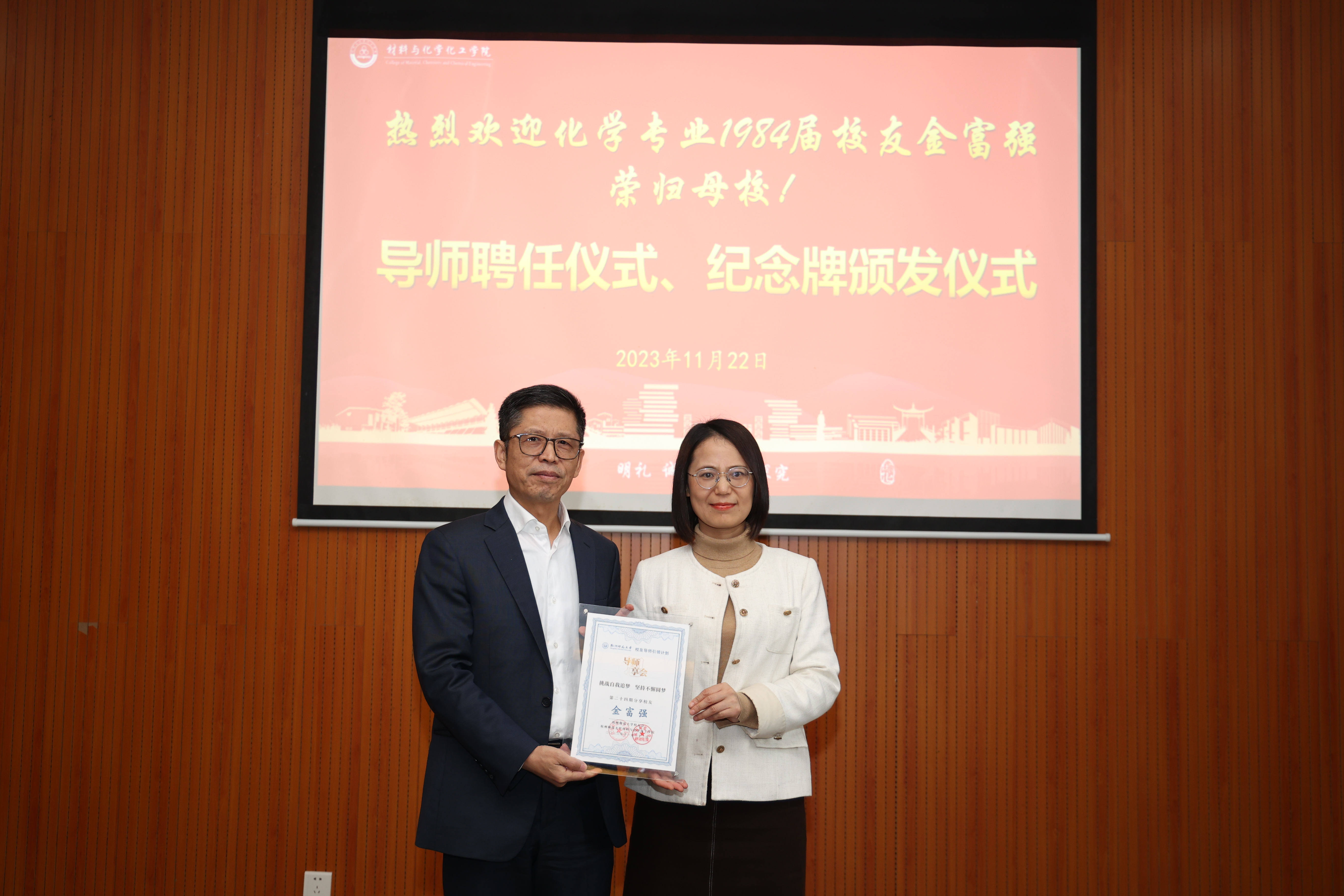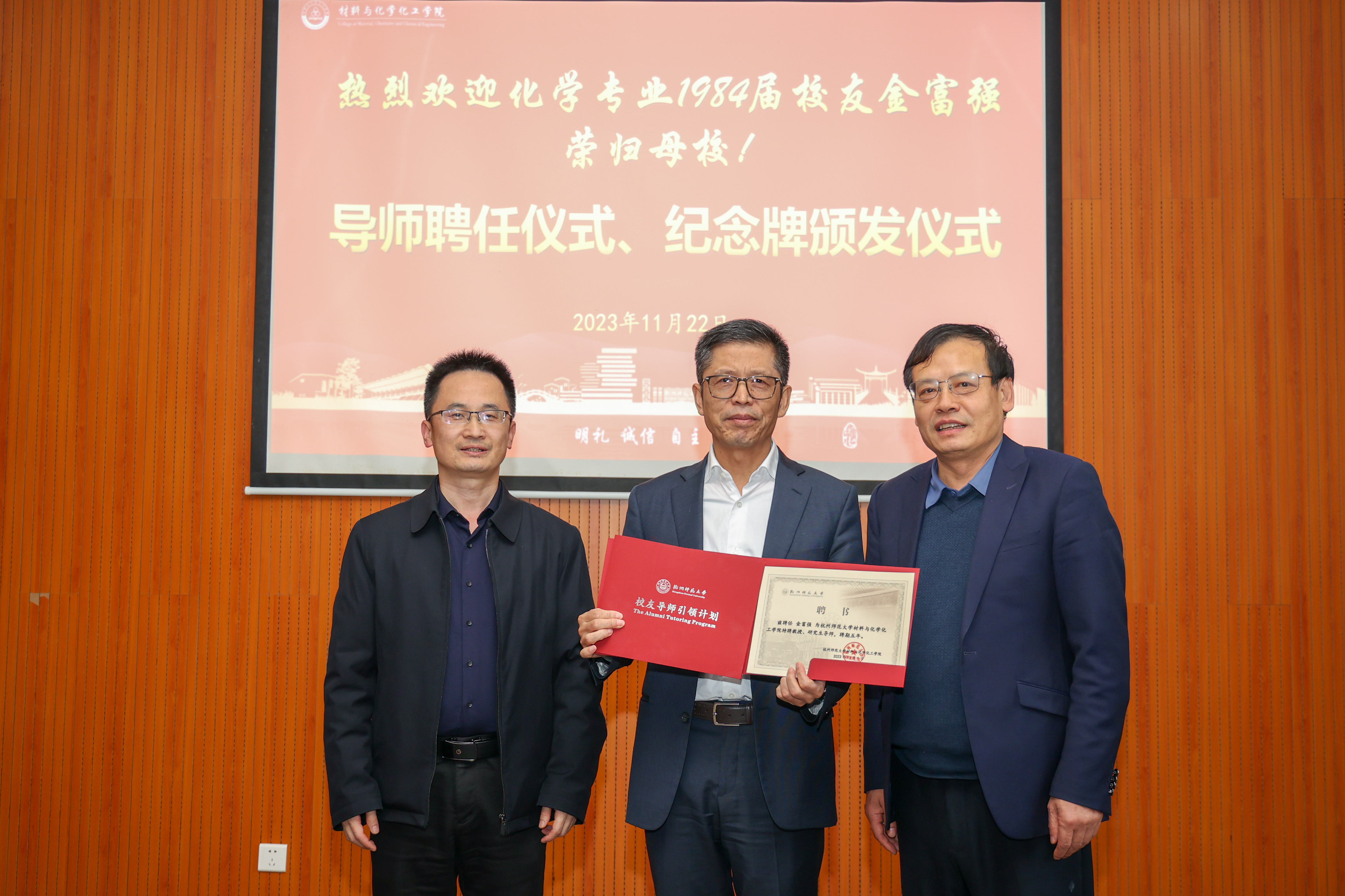 分享会伊始,现场举行了导师聘任仪式和纪念牌颁发仪式,章鹏飞、江齐里分别为金富强颁发“学院特聘教授、研究生导师”聘书和“大师兄影视 校友导师引领计划”暨“大师兄影视 学生领导力素养提升计划”导师聘书,薛少聪为金富强颁发导师思享会纪念牌。