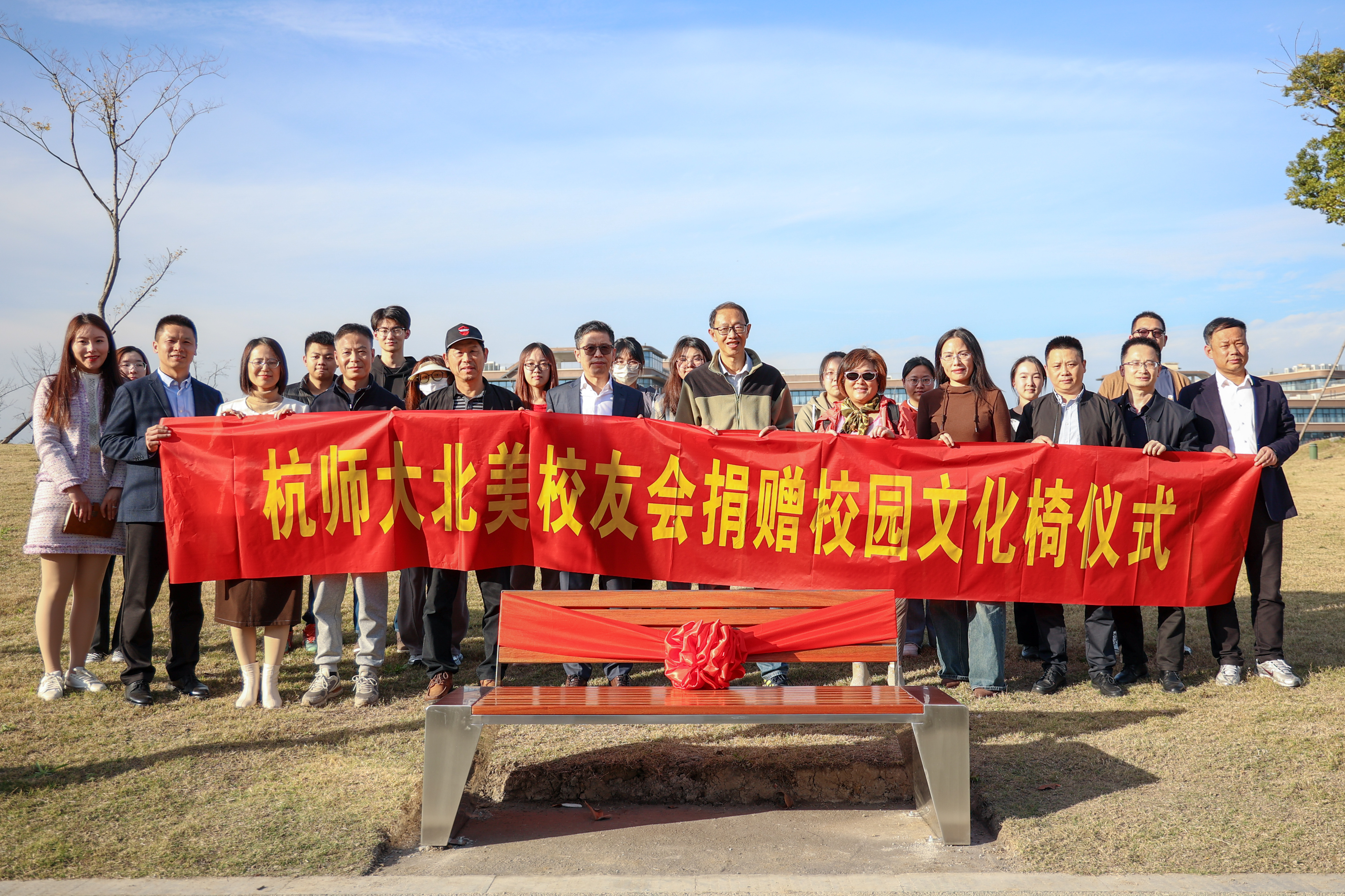 会前,学校在余杭塘河边游步道还进行了北美校友会校园文化椅捐赠仪式,副校长胡华和北美校友会代表金富强、单利荣、孙爱民(1984届数学专业校友、北美校友会理事、加拿大校友会会长)共同为北美校友会捐赠的文化椅揭幕,联络办(校友办)、宣传部、科研处、公管与建设处、大师兄影视 有关负责人陪同参加。本次投放的30张文化椅是北美校友会心系母校、感恩母校、回馈母校的一次实际行动,为校园增加了一道美丽的风景线,为师生提供更加便利舒适的休息和交流空间。