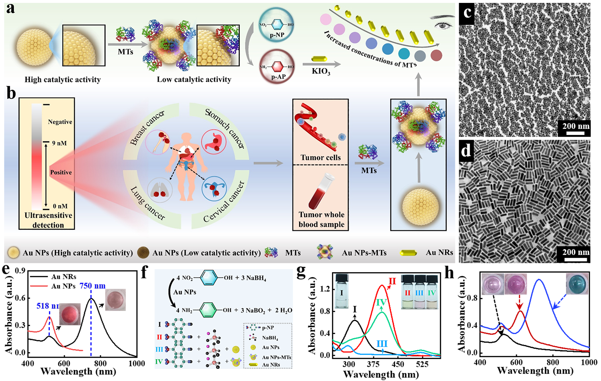 本工作针对响应速度不可控导致灵敏度较差的问题,黄又举教授团队提出了一种简单的催化调控刻蚀的比色可视化策略,用于检测超低浓度(<10 nM)的MTs。具体设计为:(1) 通过可控地将低浓度的MTs修饰到Au NPs表面来实现可控的催化单元;(2) 不同MTs调控的Au NPs催化单元通过精确控制NaBH4、对硝基苯酚(p-NP)、对氨基苯酚(p-AP)、KIO3的反应产生蚀刻剂I2;(3) 催化精确控制的化学反应从而控制Au NRs的蚀刻,输出高度鲜艳、色彩丰富的颜色结果。机理为:MTs的蛋白质电晕效应,调节Au NPs的催化活性,从而可控地调节Au NRs的蚀刻程度,以实现对MTs具有精确响应的比色可视化分析,可通过肉眼观察。该比色可视化传感器对0.1-3.5 nM范围内MTs表现出出色的线性关系,灵敏度低至28 pM。同时在检测时间上明显优于市售试剂盒(35 min VS 3 h),仅占市售ELISA试剂盒检测时间的12 %。该比色可视化传感器也已被证明对许多肿瘤细胞(乳腺癌细胞、肺癌细胞、宫颈癌细胞等)、临床血液样品和其他蛋白质中的MTs有效检测,因此在早期诊断癌症的治疗应用中具有巨大的潜力。