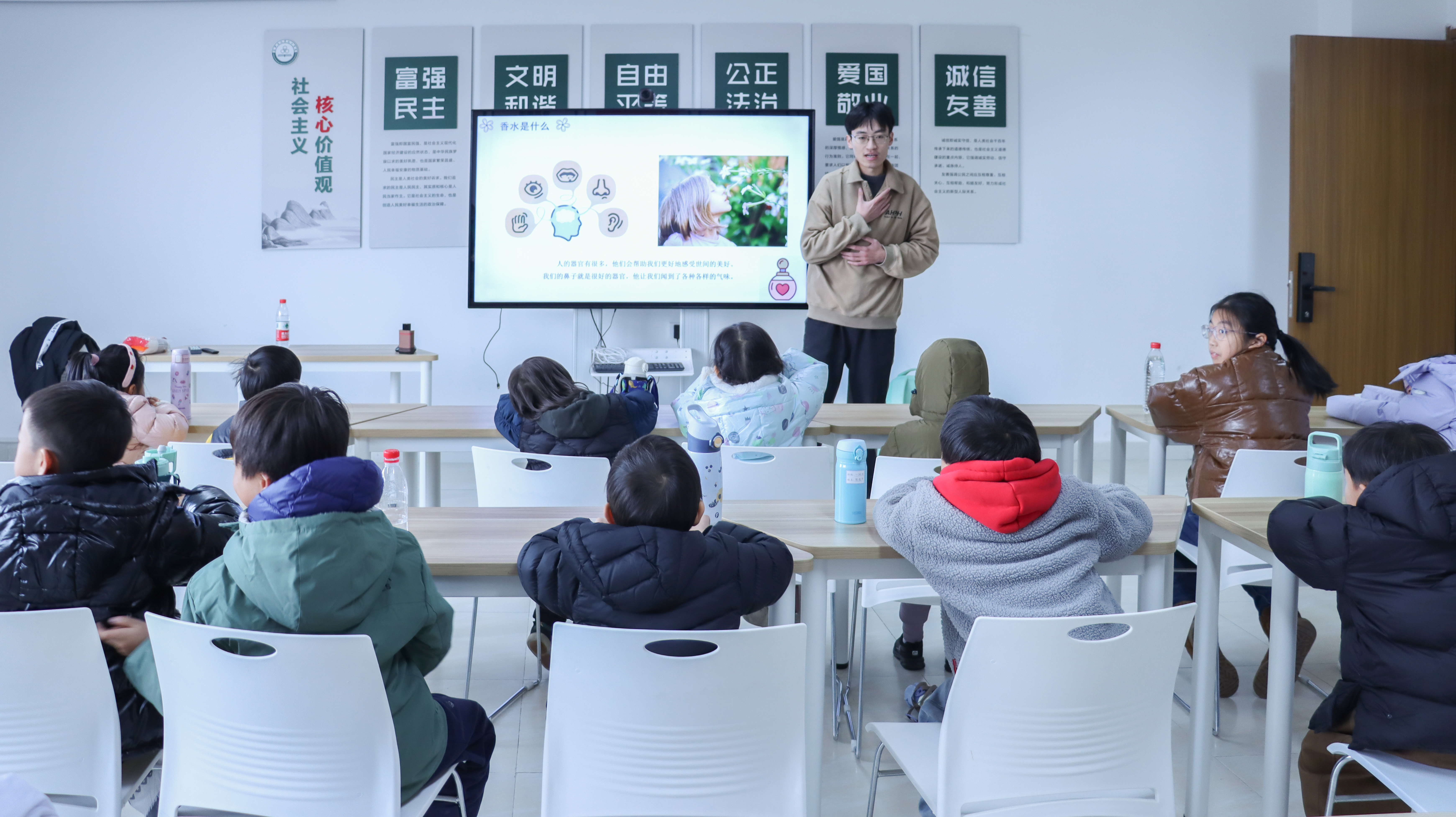 活动伊始,在勤17-206,志愿者们热烈欢迎来大师兄影视 参观的星朗德幼儿园的老师及其学生们,并紧锣密鼓、有条不紊地准备茶水与安排座位,随后进入理论知识的讲解环节。星朗德幼儿园的小朋友们在黄锴奇妙趣横生地讲解下,对香水的奥秘产生了好奇并对香水的组成及其制作方式有了一定的了解。活动现场,小朋友们听讲认真,积极与讲解员互动,氛围其乐融融。