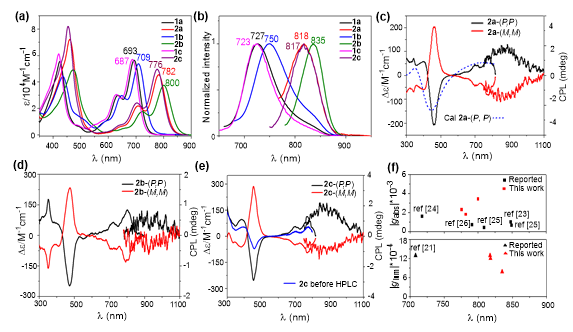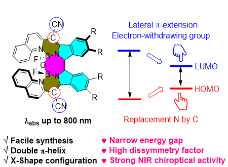 近年来,具有圆偏振发光性能的分子材料受到了广泛的关注,大部分研究都集中在可见光区,而具有近红外圆偏振发光的分子材料却鲜有报道,且多为金属配合物。金属配合物通常具有较低摩尔吸光度和量子效率,且由于其典型的d-d或f-f跃迁,其激发波长一般在紫外可见光区,无法实现吸收和发射都在近红外区。因此,设计合成具有优异近红外圆偏振发光性能的分子材料是目前的一大难点与挑战。