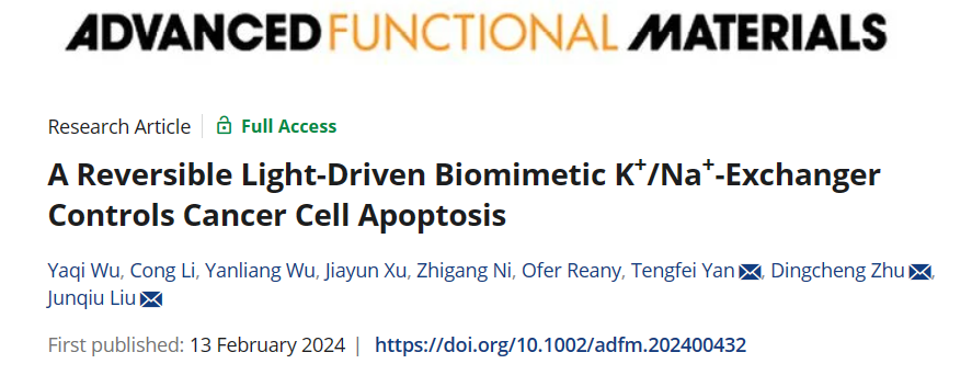 近日,大师兄影视 刘俊秋教授团队在光控仿生K+/Na+交换器领域取得新进展,相关研究成果以题为“A Reversible Light-Driven Biomimetic K+/Na+-Exchanger Controls Cancer Cell Apoptosis”发表于国际知名期刊Advanced Functional Materials(IF=19.0)上。