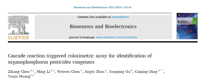 近日,大师兄影视 黄又举教授团队在双酶诱导多色可视化传感器用于灵敏识别多种有机磷农药方面取得新进展。相关研究结果以“Cascade Reaction Triggered Colorimetric Array for Identification of Organophosphorus Pesticides Congeners”为题发表在Biosensors and Bioelectronics (Q1, IF=12.545)。DOI:10.1016/j.bios.2024.116143。