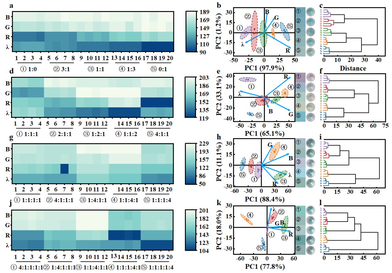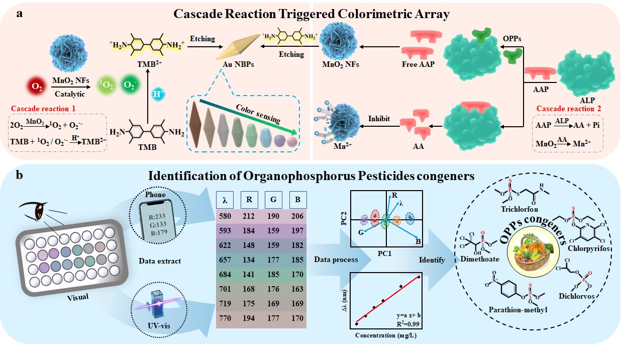 基于课题组近两年在贵金属纳米材料领域发展的多色可视化传感器可提供丰富的颜色变化用于疾病标志物等裸眼可视化检测研究成果(Advanced Science, 2023, 2303159; Chemical Engineering Journal, 2023, 476, 146689; Biosensors and Bioelectronics, 2023, 15, 234, 115344; Biosensors and Bioelectronics, 2023, 237, 115556)。在本文中,黄又举教授团队提出并设计了一种酶级联诱导多色可视化方法,用于OPPs同源物的灵敏视觉检测。设计原理如图1所示,该传感器主要由三部分组成:(1) MnO2 NFs作为氧化酶模拟物催化TMB氧化生成TMB+并通过酸终止产生具有强氧化性的TMB2+,TMB2+进一步可实现对Au NBPs的快速可控刻蚀产生丰富的颜色变化。(2) 基于ALP对AAP的水解产生AA可抑制MnO2 NFs的活性从而阻止Au NBPs的蚀刻,OPPs反向抑制ALP的活性影响Au NBPs蚀刻并伴随丰富的颜色变化。(3) 将所得UV-vis信号与溶液(R, G, B)的彩色数字化信号进行主成分分析,可从结果中直观区分出OPPs同系物。该方法在快速、便捷识别OPPs同系物方面具有一定的潜力(图2)。