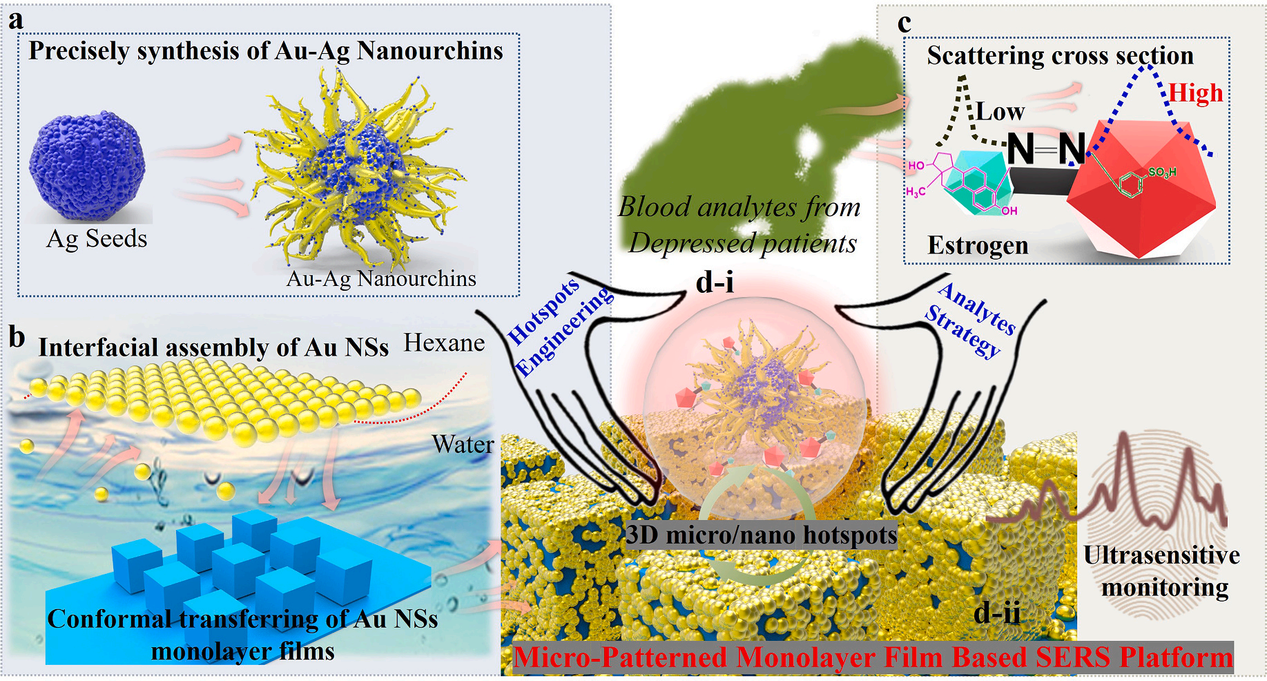 基于上述挑战,黄又举教授课题组基于等离子纳米材料二维膜构筑方法和转移技术,提出了一种集成3D热点工程和分析物策略的SERS平台,构筑的3D热点能够较好保障大多数分子周围的强热点分布,同时,通过偶氮反应将待测物的散射截面大幅提高。二者协同,可实现女性抑郁症标志物之一雌激素的高灵敏检测。一方面,构建了含有Au–Ag合金纳米海胆(AAA-NUs)和基于阵列的Au纳米颗粒单层膜(Au-NSs)的3D微/纳米等离子体基底,以实现高密度和热点可用性。另一方面,通过快速氮化反应设计分析物策略,以进一步增强叠氮化合物形式的雌激素的散射截面。在它们的协同作用下,所提出的SERS平台对雌激素表现出高灵敏度,检测极限低至10−11 mg/mL。更重要的是,通过所提出的SERS平台评估抑郁症患者的血液雌激素水平,并与临床诊断结果高度一致。这种集成的SERS平台为通用和超灵敏的生物传感铺平了道路,并在多目标检测和疾病预测中具有巨大的应用潜力。