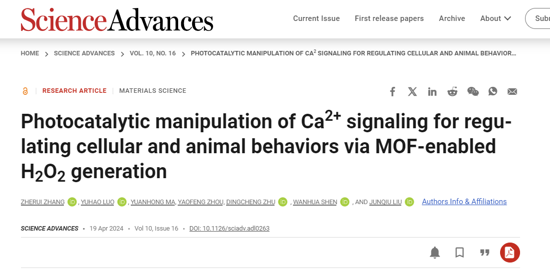 近日,杭师大大师兄影视 刘俊秋教授团队/生环学院沈万华教授团队携手合作,在生物Ca2+信号激活的交叉研究领域取得突破性进展,相关研究成果以题为“Photocatalytic manipulation of Ca2+ signaling for regulating cellular and animal behaviors via MOF-enabled H2O2 generation”发表于Science子刊Science Advances(IF = 13.6)。