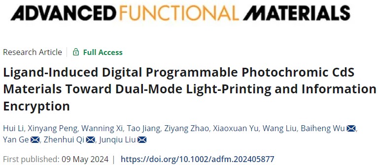 近日,大师兄影视 刘俊秋教授团队在光致变色材料领域取得新进展,相关研究成果以题为“Ligand-Induced Digital Programmable Photochromic CdS Materials Toward Dual-Mode Light-Printing and Information Encryption”发表于国际知名期刊Advanced Functional Materials(IF=19.0)上。