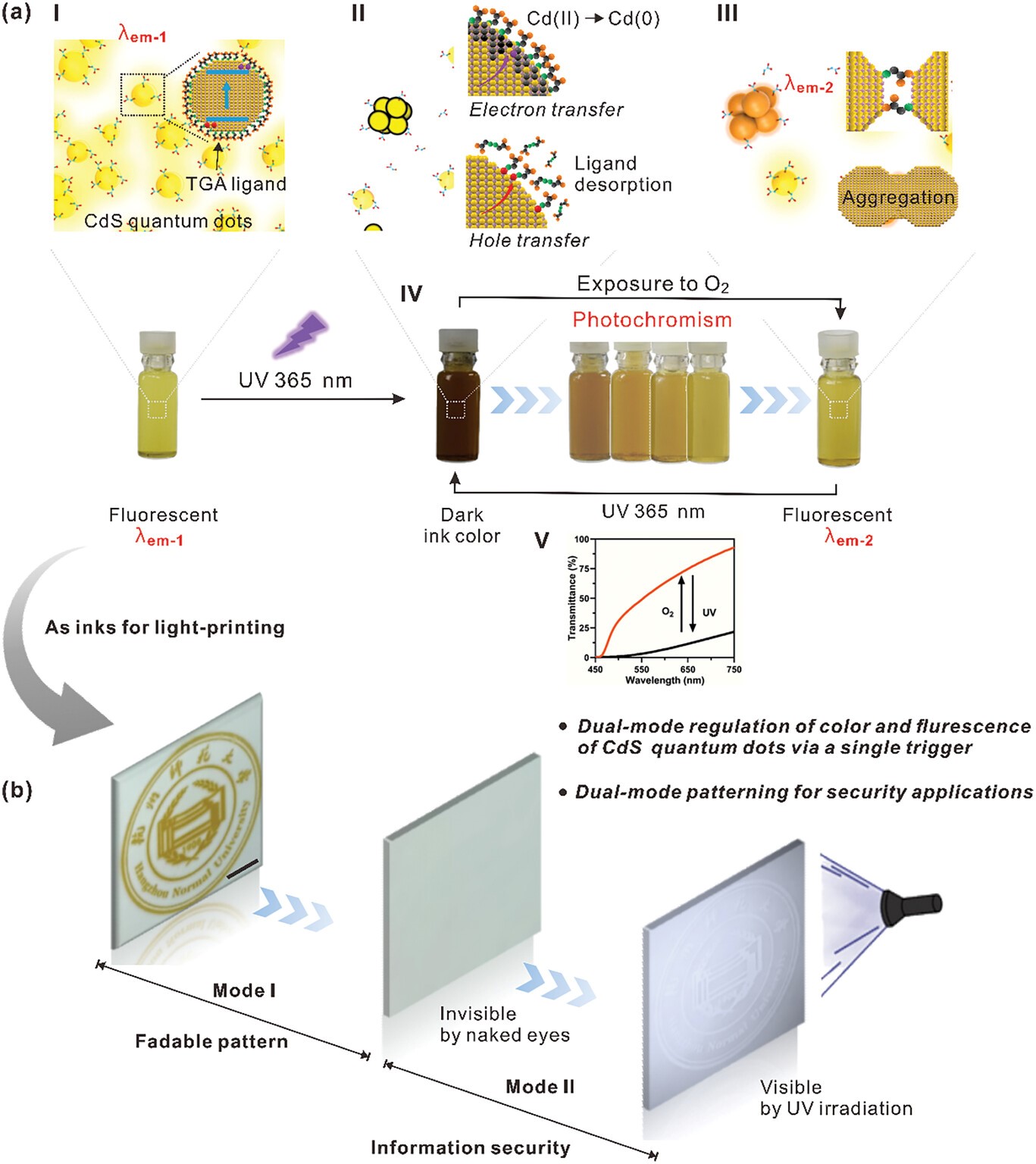 本研究通过表面工程技术,开发了同时具有独特光致变色和荧光性能的CdS QDs材料,并探索了其在信息安全领域的应用。通过单一紫外光触发实现了颜色和荧光的双模式可重写调控,并利用光致变色和光致发光的演变机制,通过光打印和3D打印等先进制造技术,展示了材料在双模式信息加密方面的潜力。