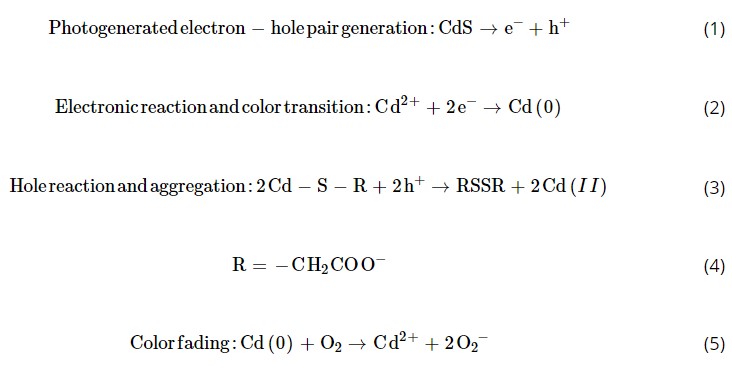2. 电子还原表面Cd (II):光激发的电子填充到导带中,并将表面Cd (II)还原为Cd (0),引起颜色从黄色到黑色的变化。