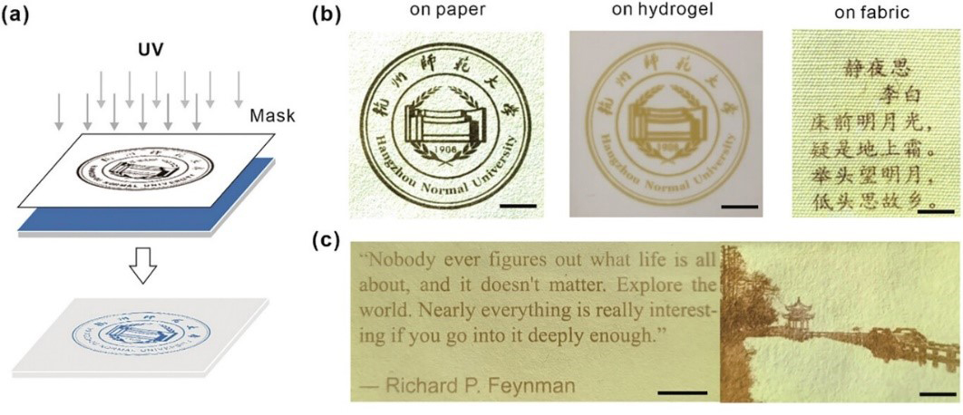 CdS QDs可负载在不同基底(如纤维素纸、水凝胶和棉布)上,利用紫外光照射印刷,基于量子点的光致变色实现了精美的图案化。更进一步,同时利用其光致变色和荧光发射特性,负载在凝胶基质中的CdS QDs展现出双模态的信息加密功能。在高功率紫外光照射印刷后,材料显示光致变色图案,该图案在环境氧气作用下逐渐消退回复至初始状态;随后在低功率紫外光照射下,由于照射前后量子点的荧光发射发生改变,可以显示隐藏加密信息。