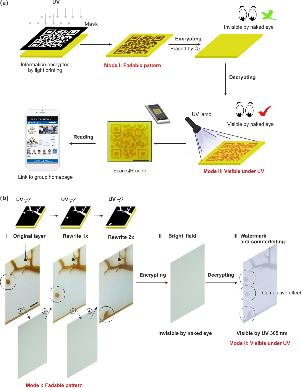 研究人员提供一个双模信息加密的二维码实例,展示了如何使用光打印技术在水凝胶表面编码信息。在典型环境光照条件下,水凝胶保持透明,隐藏了信息。在紫外光照射下,荧光二维码变得可见,可以通过智能手机扫描来检索加密信息。并且,上述双模态信息加密材料可进行多次重复擦写,每次擦写过程中均可体现两种模式下的加密特征。单次光打印后,材料可即时显示与打印结构对应的可消退光致变色图案;然而,多次光打印后,紫外显影的荧光图案呈现为多次光照图案的叠加,表现出明显的累积效应,为交互式信息加密奠定了基础。