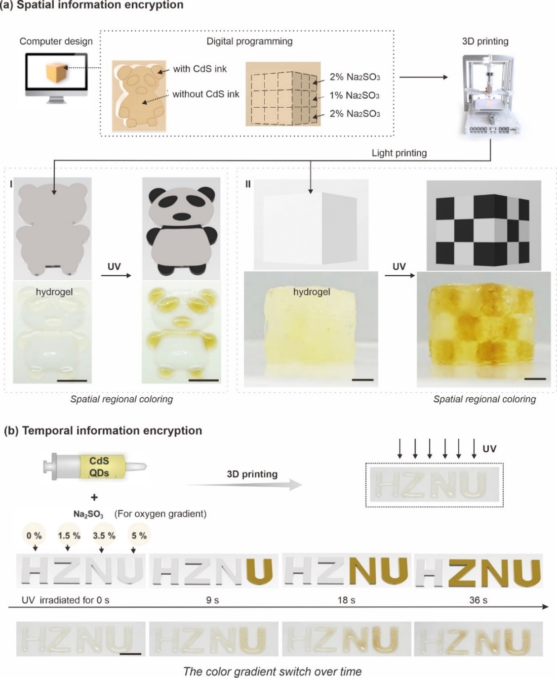 最后,研究人员进一步拓展了CdS QDs在3D打印领域的应用,发展了颜色随时间演变的可数字编程智能材料。利用亚硫酸钠调控3D打印墨水中的氧气浓度梯度,从而实现3D打印材料在紫外光照射下的随时间颜色变化。