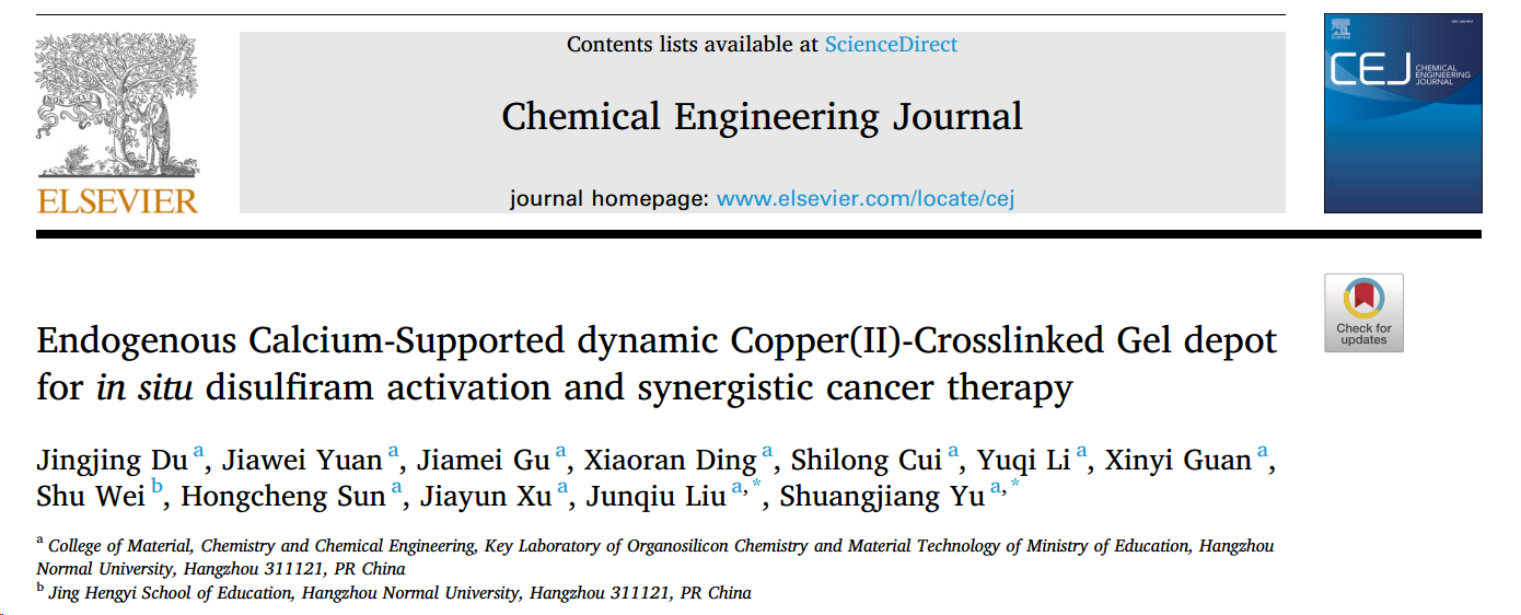 近日,大师兄影视 刘俊秋教授团队在载药水凝胶用于肿瘤局部联合治疗方面取得新进展。相关研究结果以“Endogenous Calcium-Supported dynamic Copper(II)-Crosslinked Gel depot for in situ disulfiram activation and synergistic cancer therapy”为题发表在Chemical Engineering Journal (IF: 15.1)。