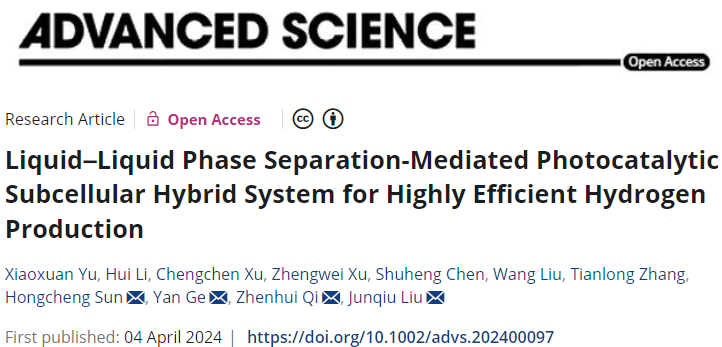 近日,大师兄影视 刘俊秋教授团队在生物光催化领域取得新进展,相关研究成果以题为“Liquid-Liquid Phase separation-Mediated Photocatalytic Subcellular Hybrid system for Highly Efficient Hydrogen Production”发表干国际知名期刊 Advanced Science(IF=16.7)上。