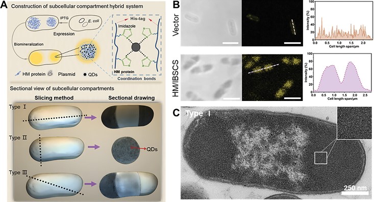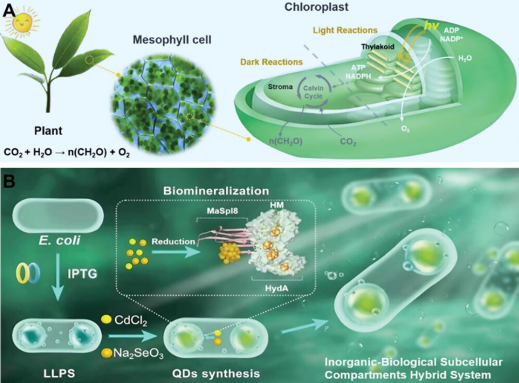 研究中,通过基因工程技术将重组氢化酶(HydA)和丝素蛋白(MaSpI8/IDPs)融合蛋白(HM)与量子点(Quantum Dots, QDs)共组装,形成无机-生物亚细胞混合系统(Inorganic-Biological Subcellular Compartments Hybrid System, IBSCS)。该系统在细胞内形成特定的亚细胞区室,促进了高效的电子传递和光能利用,显著提高了氢气产生效率。实验结果表明,光激发的电子直接转移到氢化酶,减少了电子与空穴的复合,提高了光合作用效率。