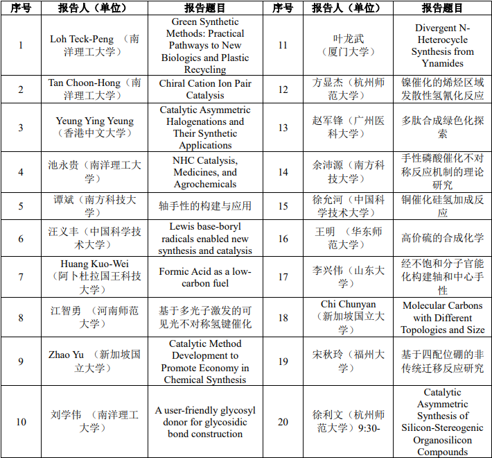 研讨会特邀请Loh Teck Peng(罗德平)院士、Tan Choon Hong(陈俊丰)院士(现任新加坡国家科学院副院长)分别作了“Green Synthetic Methods: Practical Pathways to New Biologics and Plastic Recycling” 和“Chiral Cation Ion Pair Catalysis”的精彩报告,引起在座各位专家的热烈探讨。