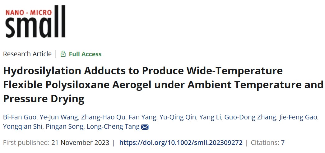 近日,大师兄影视 汤龙程教授团队在有机硅气凝胶隔热领域取得新进展,相关研究成果以题“Hydrosilylation Adducts to Produce Wide-Temperature Flexible Polysiloxane Aerogel under Ambient Temperature and Pressure Drying”发表于国际知名期刊Small(IF=13.3)上。