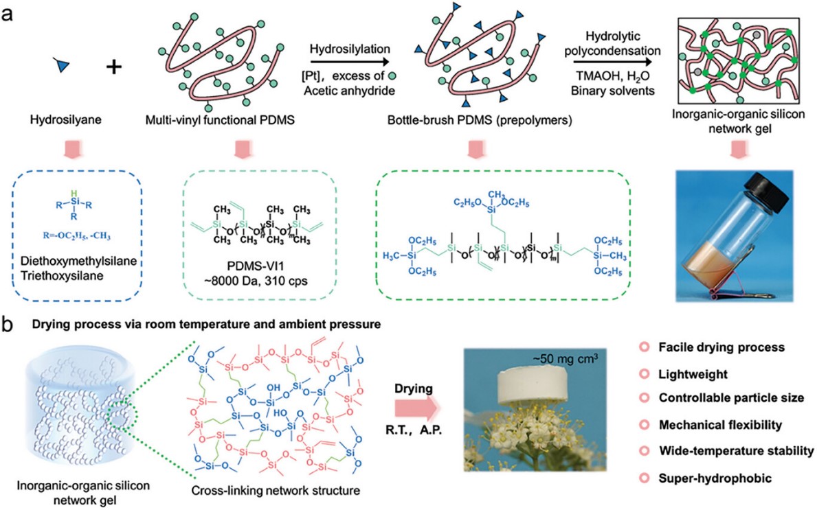 近日,大师兄影视 汤龙程教授团队报道了一种新的常温常压干燥柔性气凝胶干燥技术,通过在以Si-O-Si为主链的大分子上引入可溶胶-凝胶的官能团,以改善硅基气凝胶的脆性粉化问题。硅氢加成反应是有机硅化学中最重要的反应之一,通常在催化剂(铂、铑等)作用下选择性地进行硅氢键与含不饱和键化合物的加成反应。在本研究中,通过硅氢加成技术将含氢硅烷(DMST)接枝在端侧基含乙烯基聚硅氧烷(PDMS-VI1)的分子链段上,形成“瓶刷型”聚硅氧烷大分子(bottle-brush PDMS)。该预聚物在碱性条件下将发生烷氧基团的脱水和缩合反应,而形成类果冻状的湿凝胶,经过常温常压干燥可获得极低密度(~50 mg/cm-3)且兼具回弹性的有机硅气凝胶。