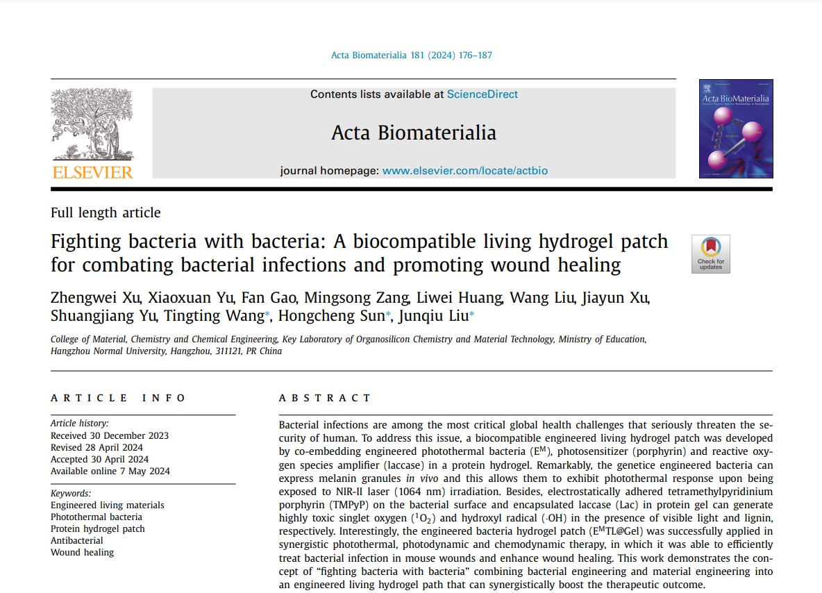 近日,大师兄影视 刘俊秋教授团队在活体生物材料用于疾病治疗方面取得新进展。相关研究结果以“Fighting bacteria with bacteria: A biocompatible living hydrogel patch for combating bacterial infections and promoting wound healing”为题发表在Acta Biomaterialia (IF= 9.7)。