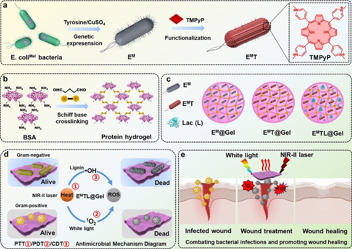 为了促进细菌感染的治疗效果并在时空上限制工程细菌的感染,大师兄影视 刘俊秋教授团队提出“以菌抗菌”的概念,将工程光热细菌与蛋白质水凝胶平台相结合,开发了一种生物相容性、多模式、工程活蛋白质水凝胶贴片,用于结合活性氧(ROS)和细菌的光热疗法(图1)。首先构建了一种黑色素基因工程大肠杆菌(EM)并用于体内表达黑色素颗粒,表现出良好的光热响应。带正电荷的四甲基吡啶卟啉(TMPyP)被吸附在EM(EMT)表面,通过避免聚集和提高PDT抗菌剂的量子产率,促进光介导产生剧毒单线态氧(1O2)。漆酶(Lac)是一种含铜多酚氧化酶,被引入以在木质素存在的有氧条件下催化有毒ROS的产生。最后,通过戊二醛交联,将工程化的 EMT 生物杂化物和 Lac 酶 (EMTL@Gel) 共同嵌入生物相容性牛血清白蛋白 (BSA) 水凝胶贴片中。