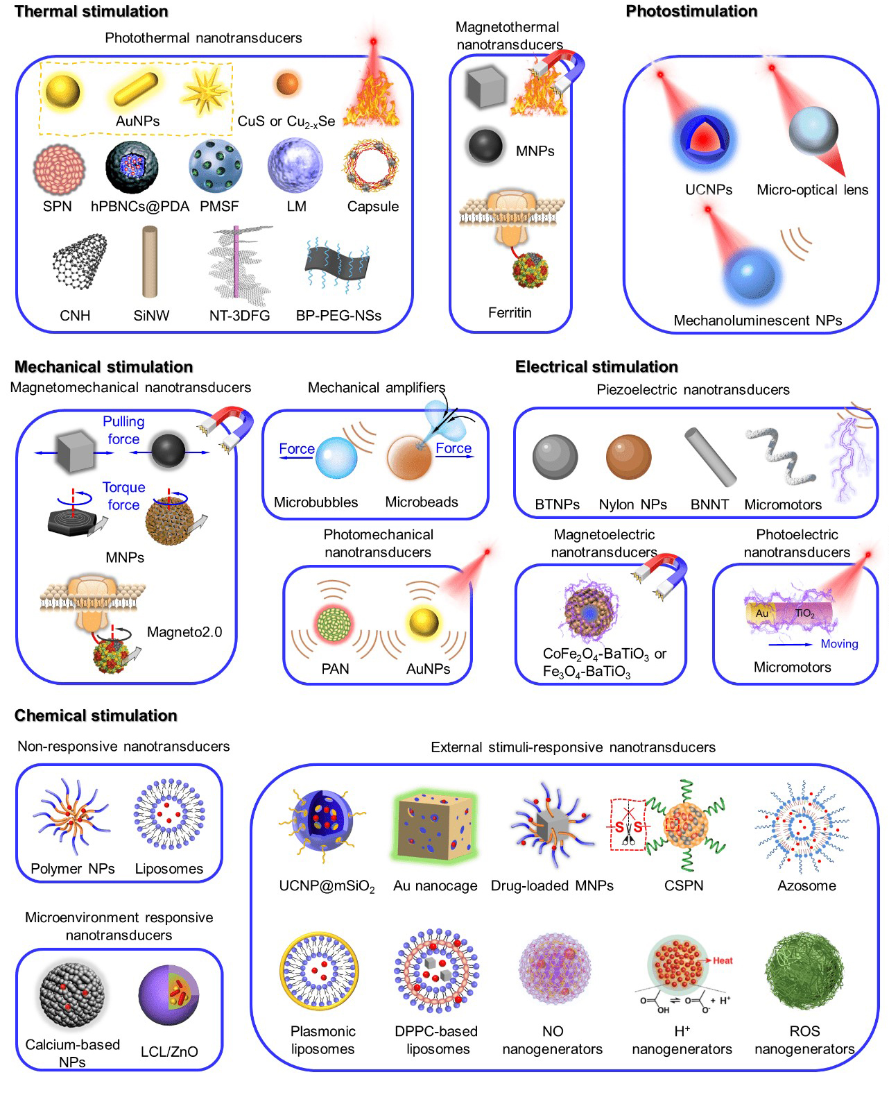 该综述从外界刺激信号的角度,将纳米转化器的调控方式分为热、光、机械力、电、化学信号调控五大类。对于每一大类,先分别总结了其对应激活的Ca2+通道和激活阈值,再根据输入的外界刺激的不同,阐明纳米转化器的能量转化原理和材料设计特性,便于梳理各类繁琐的结构。同时横向对比了纳米转化器在组织穿透、响应速率、毒副作用等方面的优缺点。