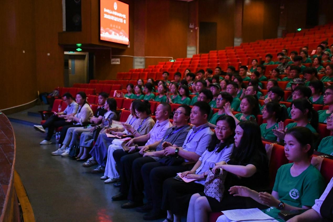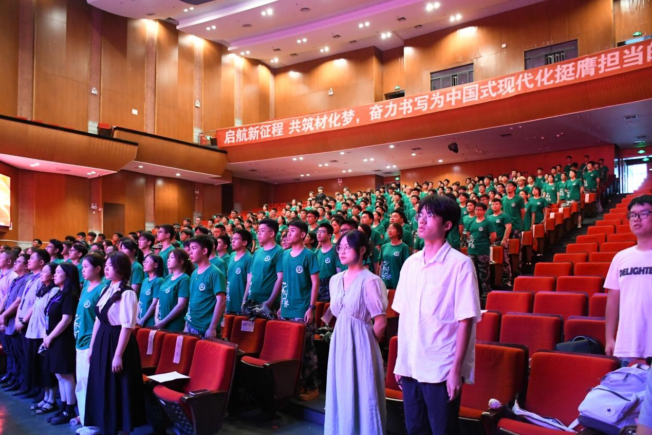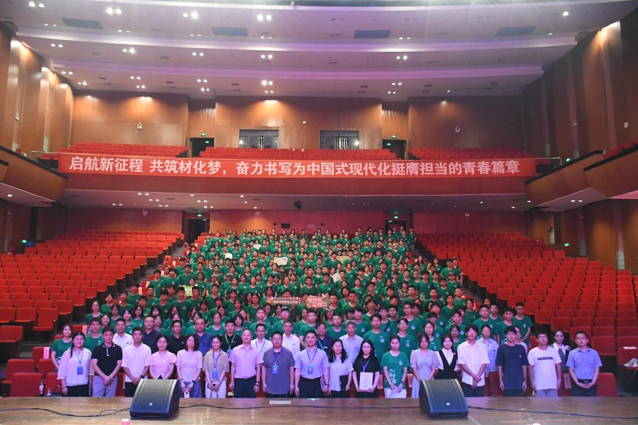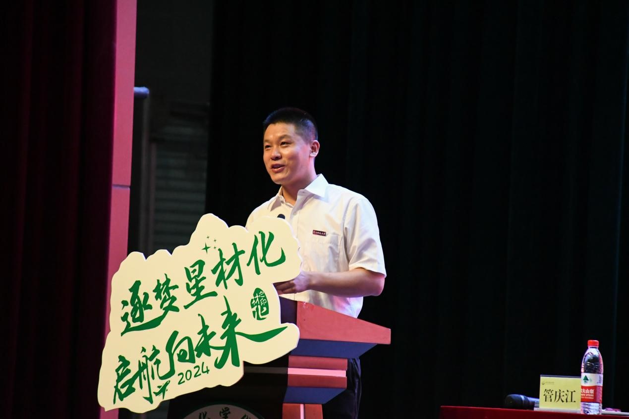 学院院长章鹏飞,党委书记江齐里,校友代表、1984届化学教育专业校友金富强,副院长李志芳、黄又举,党委副书记管庆江,院长助理、化学系主任邵欣欣,院长助理、化工系主任汤龙程,院长助理、高分子系主任于双江, 2024级新生班主任团队,全体辅导员与每一位满怀憧憬和期待的新生们共赴这场关于梦想启航、青春绽放的盛宴。开学第一课由管庆江主持。