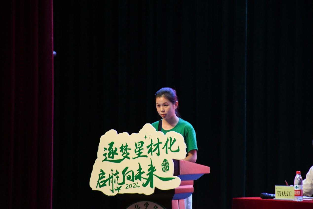 新生代表、化学师范241班的朱桓钰分享三句诗文与大家共勉:一、“莫等闲”,强调自律与珍惜时间;二、“千淘万漉”,鼓励坚持理想与努力不懈;三、“勤慎诚恕,博雅精进”,倡导恪守校训,追求学术与品德并重。