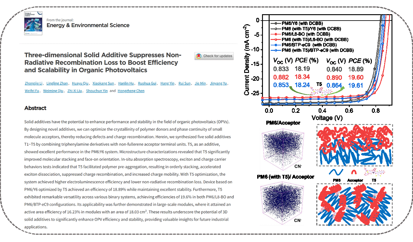 1. 固体添加剂策略: 通过设计新型固体添加剂,可以优化聚合物给体的结晶性和小分子受体的相连续性,降低缺陷和电荷复合,从而提高光伏效率和长期工作稳定性。研究人员结合三苯胺衍生物和非富勒烯受体末端单元,合成了固体添加剂T1~T5,探究它们与PM6:Y6体系的相容性和作用效果。T5作为固体添加剂,在PM6:Y6体系中表现出色。实验结果验证T5能够显著改善活性层分子的堆积和取向,提高聚合物分子的有序性;T5有助于聚合物给体的预聚集,实现更有序的堆积,加快激子解离,抑制电荷复合,提升电荷迁移率;在T5的优化下,体系能够实现更高的电致发光效率和更低的非辐射复合损失。因此,T5优化的PM6与Y6制备的器件展现了高达18.89%的效率,且具有良好的稳定性。T5在其他二元体系中也表现出普适性(PM6/L8-BO及PM6/BTP-eC9的二元体系都实现19.6%的效率),证明了其在提高有机光伏效率和稳定性方面的潜力。此外,T5优化的大面积模组(18 cm2)可以实现高达16.3%的模组效率,为产业化提供了理论指导(Energy Environ. Sci., 2024, DOI: 10.1039/D4EE03394A)。