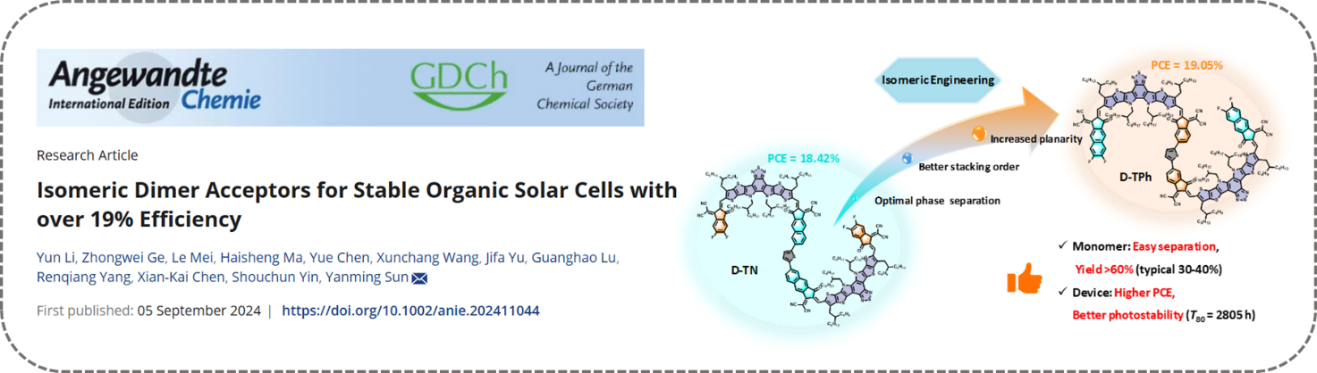 2. 异构化分子策略:研究人员通过异构化分子设计策略,优化分子内平面性和分子间堆叠,实现有机光伏器件效率和稳定性提升。该工作通过改变端基位置,设计合成两个二聚体受体异构体,分别命名为D-TPh和D-TN,通过与PM6给体搭配构筑的光伏器件,研究人员探究了异构化对二聚体受体材料光电性能的影响。发现与D-TN相比,D-TPh具有增强的主链平面度、提高的最低未占据分子轨道能级和更有序的分子堆叠。因此,基于PM6:D-TPh的器件实现了19.05%的功率转换效率(PCE),而对应D-TN的器件效率仅为 18.42%。此外,面积为1 cm²的PM6:D-TPh器件效率为18.0%,为已报道器件中属于较高水平。PM6:D-TPh器件的外推T80寿命超过2800小时,表现出优异的器件工作稳定性。这些结果表明,同分异构策略是优化二聚体受体分子构型以制备高效稳定的有机太阳能电池的有效方法(Angew. Chem. Int. Ed. 2024, DOI://doi.org/10.1002/anie.202411044)。