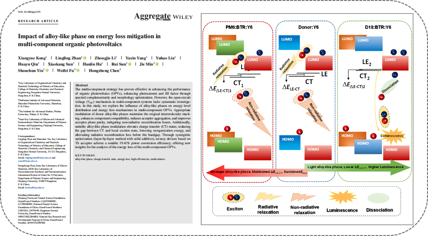 4. 多元体系能损优化策略:多元策略被证明是实现有机光伏器件性能突破的有效途径,通过光谱互补和形貌优化,大部分多元器件都可以实现光电流和填充因子的提升。但是对于多元体系的开路电压机制,尚缺乏系统的研究。研究人员通过构筑不同程度的合金相模式多元体系,详细探究了合金相程度如何影响多元有机光伏的能级分布和能量损失机制。发现合适的给体合金相模式,既可以保持原给体的强分子间堆积,又可增加多元体系给受体之间的相容性,降低受体的聚集性,提高受体的相纯度,从而实现体系非辐射复合损失;此外,合适的合金相模式可以实现多元体系CT态的提升,以及CT-LE态之间差距的降低,实现多元体系重组能的降低和带隙以下辐射复合损失的缓解;最终在优化的激子和载流子行为协同下,实现基于Y6受体的三元器件可以实现高达19.4%的光电转换效率。该工作为多元体系的相分布和能量损失解析提供了新的思路(Aggregate, 2024, 5, e553)。