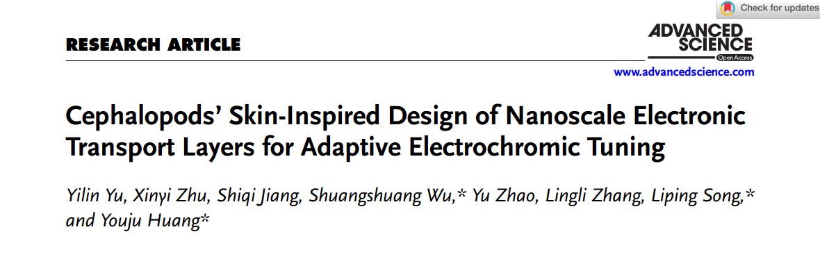近日,大师兄影视 黄又举教授带领的纳米生物传感器团队在电致变色皮肤研究方面取得新进展,相关研究以题为“Cephalopods’ Skin-Inspired Design of Nanoscale Electronic Transport Layers for Adaptive Electrochromic Tuning”在国际材料/化学领域权威期刊Advanced Science (Q1, IF=14.3)上发表。DOI:10.1002/advs.202405444。