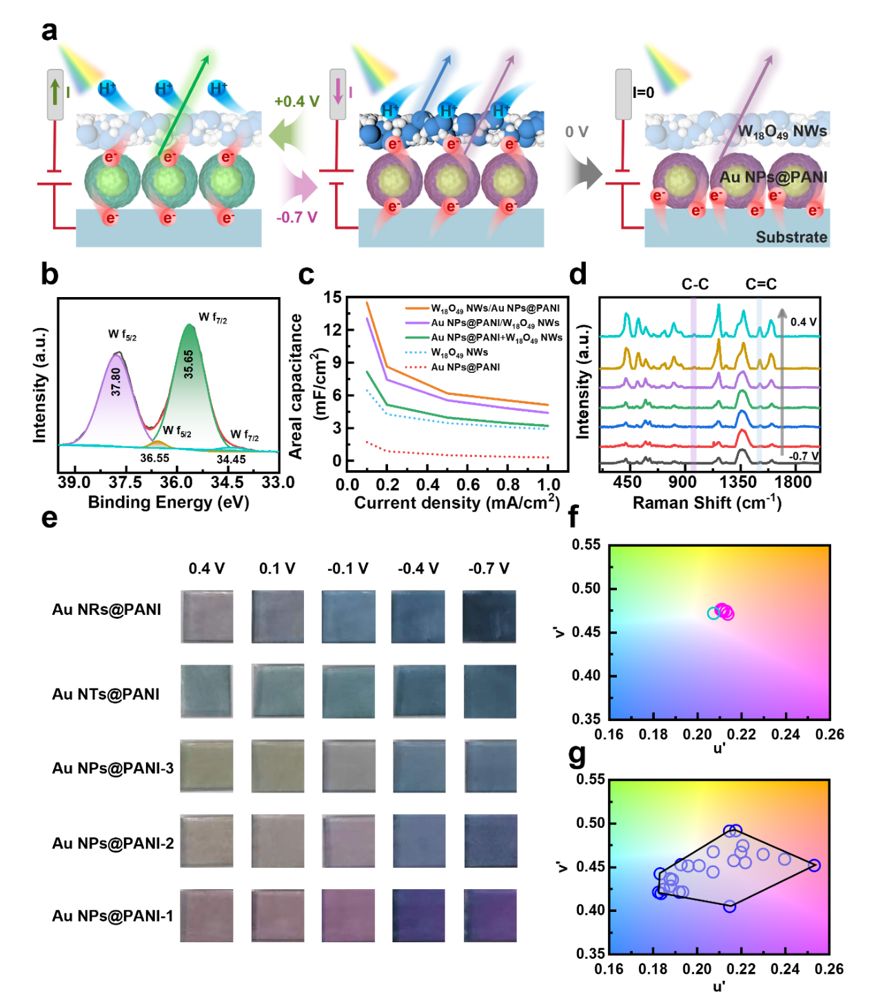 图1 a)不同偏压下电致变色过程中H+和e−运动的示意图。b)Au NPs@PANI/W18O49 NWs复合纳米薄膜中W 4f的高分辨率XPS光谱。c)不同电流密度(1.0、0.8、0.5、0.2和0.1 mA cm–2)下Au NPs@PANI、W18O49 NWs、Au NPs@PANI/ W18O49 NWs和W18O49 NWs/Au NPs@PANIf复合膜的电容。d)不同电压下Au NPs@PANI/ W18O49 NWs复合膜的拉曼光谱。 e) 三层纳米薄膜结构的光学照片,该结构包括 Au NPs@PANI-1、Au NPs@PANI-2、Au NPs@PANI-3、Au NRs@PANI 和 Au NTs@PANI,其中 W18O49 NWs 层厚度不同。f) 在不同施加电位下 Au NPs@PANI 和 W18O49 NWs 的放大 CIE 色坐标。g) 在不同施加电位下不同复合纳米薄膜的放大 CIE 色坐标。
