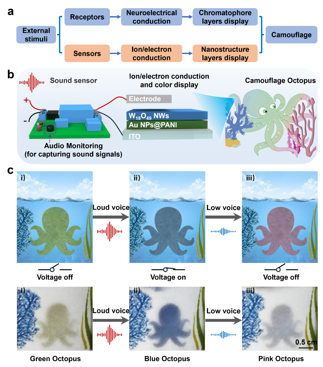 图2 a) 章鱼及仿生装置面对环境变化的刺激反应、信号转导与皮肤伪装流程图。b) 人工色素细胞的多层结构以及仿生章鱼、声音传感器、电池组成电致变色仿生系统示意图。c) 章鱼在不同环境下变色示意图及光学图像。