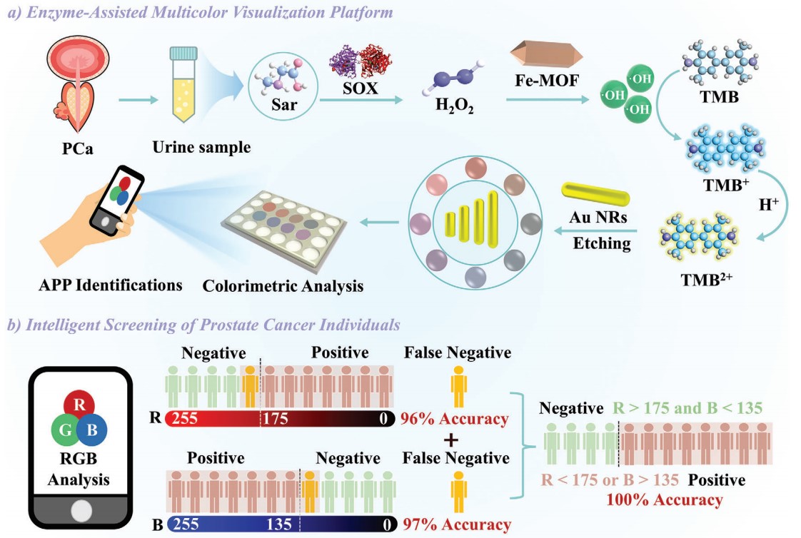 图1 (a)酶辅助多色可视化平台示意图。(b)两种RGB颜色融合用于智能PCa诊断的原理图。