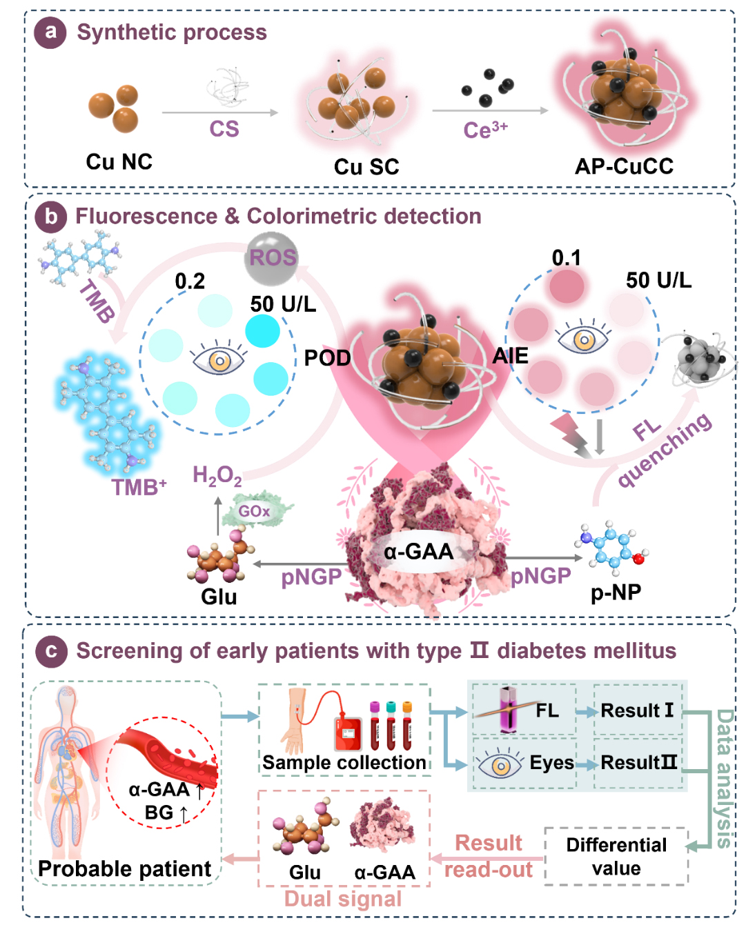 在此基础上,黄又举教授团队成功研发并整合了一款集类过氧化物酶活性与聚集诱导发射特性于一身的多功能铜纳米探针——AP-CuCC。该探针展现出对α-葡萄糖苷酶催化底物4-硝基苯基-β-D-吡喃葡萄糖苷两种分解产物(即对硝基苯酚与葡萄糖)的高度选择性识别能力。具体而言,AP-CuCC的荧光信号会在对硝基苯酚的存在下发生猝灭,而其内置的类过氧化物酶活性则能敏锐捕捉葡萄糖氧化酶催化葡萄糖水解产生的双氧水,进而触发比色反应,生成直观的色彩信号。这一巧妙设计,使得我们能够通过比色法与荧光模式的双重检测手段,实现对α-葡萄糖苷酶活性的精准监测。尤为值得一提的是,该探针凭借高特异性的荧光检测技术,成功实现了正常血液葡萄糖与酶催化葡萄糖的有效区分,极大降低了假阳性结果的出现概率,从而让葡萄糖水平成为糖尿病辅助诊断中一项极具价值的指标,显著提升了早期糖尿病患者的筛查准确性。