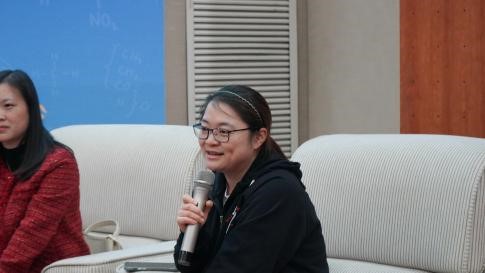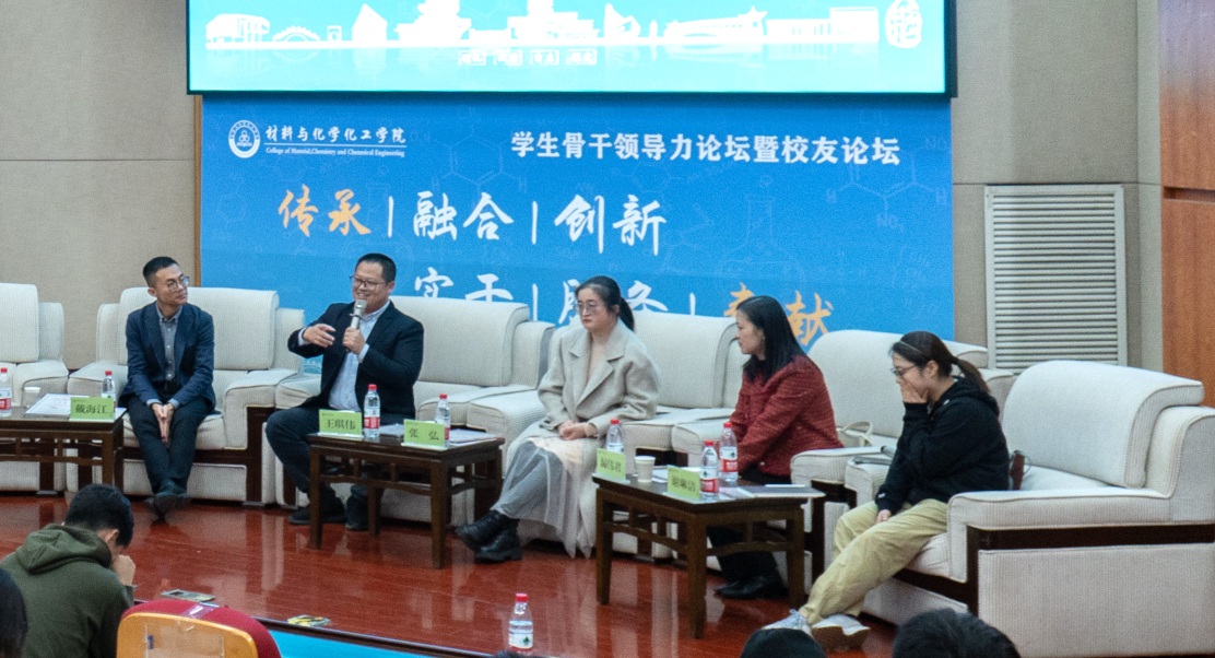 在分享环节,各位校友围绕目前从事的工作、当年学生工作经历以及自己的感悟思考进行分享,气氛热烈,掌声不断。王琪伟以学历展开话题,提出了当前公司企业对人才的要求,呼吁同学们努力学习,尽早提升学历,本科生和硕士生和博士生的起点就不一样,结合自己大一到大四学生工作历程、学院第一届学生会的成立过程和参加挑战杯的经历,他希望同学们在各种各样的校园活动中不断打破认知,提升统筹能力、执行能力和沟通能力。戴海江为同学们分享了新高考物化捆绑带来的新的就业形势,以精准的数据展示给同学们,期望大家精进学业,丰富社会阅历,抓住时代机遇,他指出,加入学生组织对于提升自身能力为今后从事班主任工作和课堂管理非常有帮助。张弘以自己在工作和考研之间的抉择插曲为切入点,从一线班主任的视角,生动讲述对于一名师范生来说,如何站稳三尺讲台,练就“硬本领”的重要性,她强调,本科生不着急工作,在可以安心读书的年龄先多读几年书。漏伟君结合现阶段教师招聘基本上是研究生的鲜活案例,深入解读市场中对教师的要求,包括学校、成绩以及荣誉称号等,而后,以她的学生经历、工作经历为故事线,号召大家珍惜大学时光,勇敢尝试各种各样的活动,不要畏惧失败,敢于挑战、超越自我。谢琳洁为大家分享了自己在选择担任村官还是留在学校担任科研助理的经历以及选择后的发展情况,回忆了当时学院新成立后师生一起设置“灵创作空间”社团和“贵之稀化研社”社团的过程和设计制作院徽、院印的过程,她强调了学生工作带来的成长优势,鼓励大家加强沟通交流,提升学生干部的自我效能。