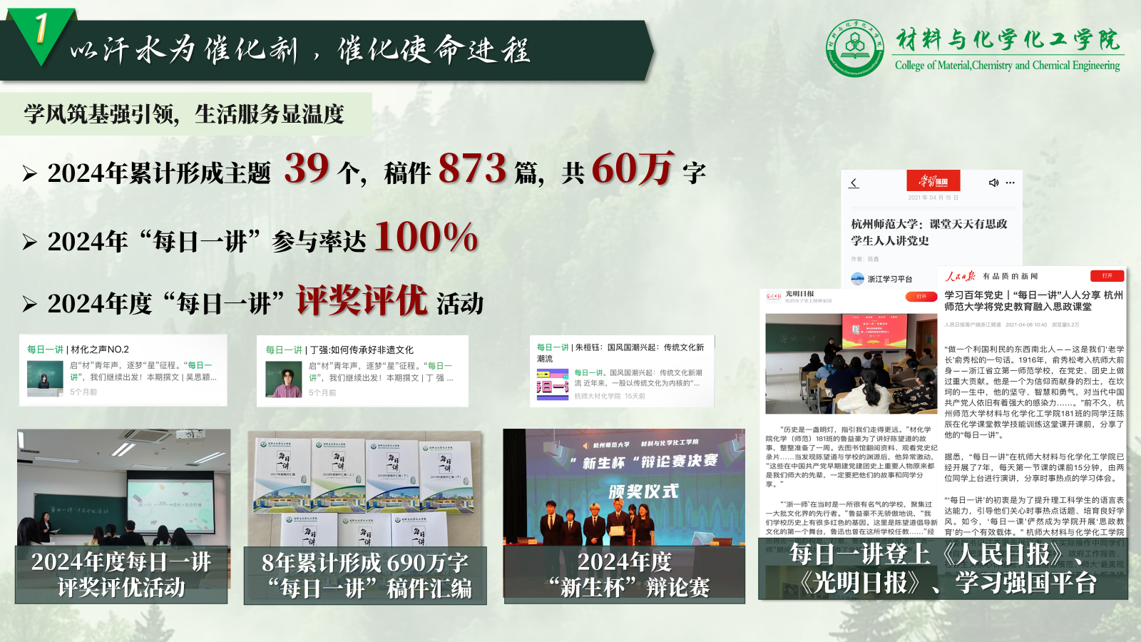 其中,“每日一讲”品牌活动累计形成主题39个,稿件873篇,共计60万字,并荣登《人民日报》、《光明日报》、学习强国等权威平台。同时,学生会还积极响应校“文明寝室建设月”活动,通过举办寝室设计大赛、寝室微视频大赛等活动,丰富同学们课余生活。