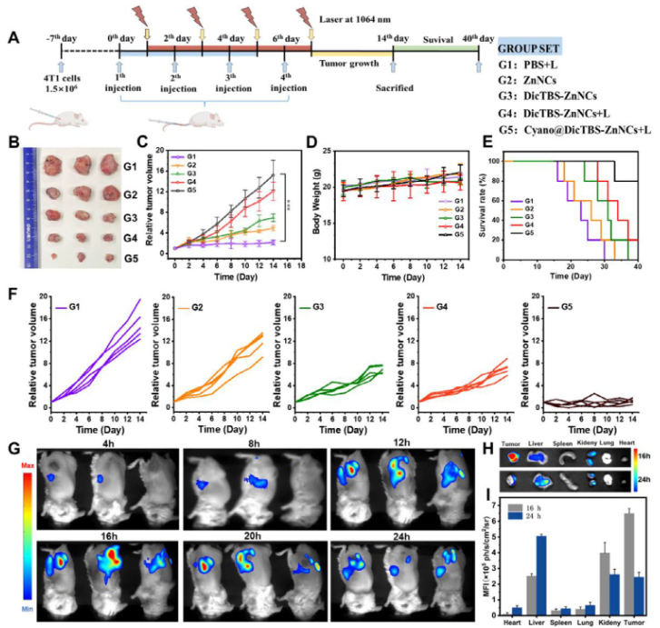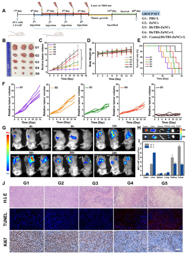 动物实验进一步验证了该系统的治疗效果。活体成像显示,系统能高效靶向肿瘤部位,并在光照条件下产生显著的治疗效果。与对照组相比,治疗组肿瘤生长明显受到抑制,小鼠生存期显著延长。同时,系统展现出良好的生物相容性,未对主要器官造成明显损伤。