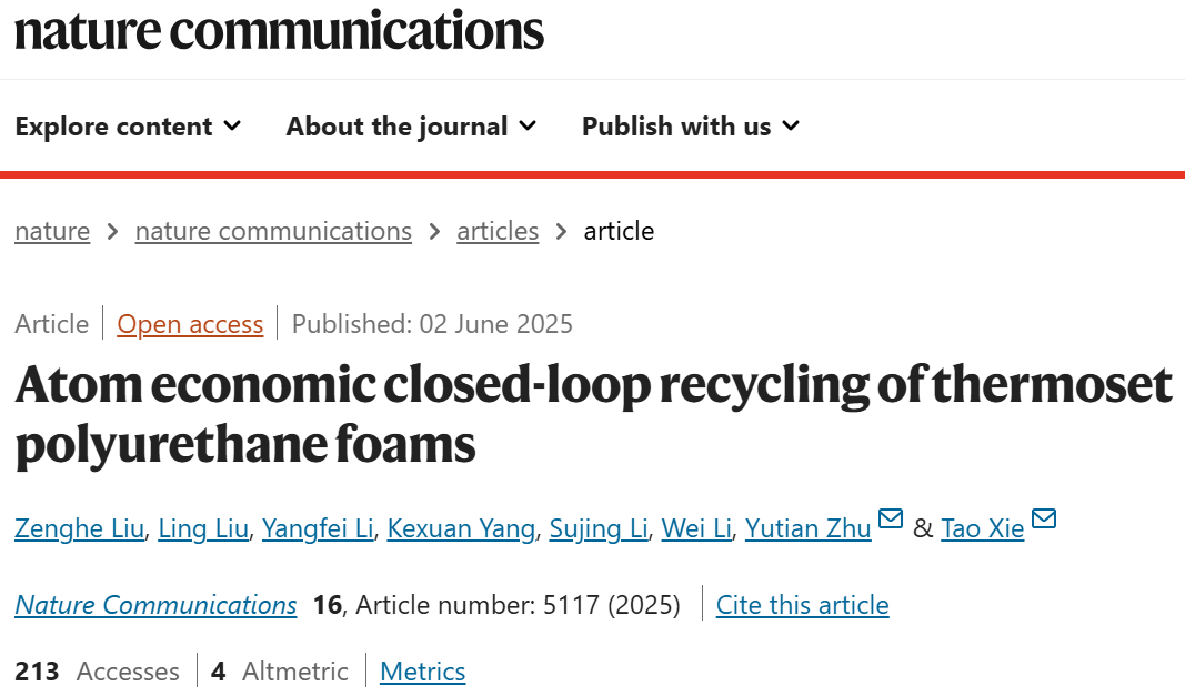 朱雨田教授团队在Nature Communications报道原子经济闭环回收热固性聚氨酯泡沫的研究成果