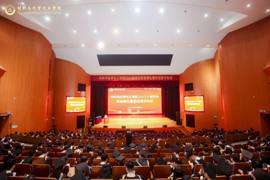 章鹏飞代表学院致辞,他向全院547名2025届本研毕业生送上热烈祝贺和美好祝愿,衷心感谢师长、家长和亲友们的辛勤付出和陪伴。他深情回顾了同学们在校期间的奋斗与成长,与学校和学院一起在青春的画卷上勾勒出最迷人的风景,实现了同频共振、双向奔赴。他以《越山丘 藏岁月 书华章》为题给毕业生讲授在校的“最后一课”,提出三点期望:一是越山丘,淬炼成长锋芒,在跨越挫折中成长成熟,收获成功与领悟;二是藏岁月,定格温暖时光,珍惜身边温暖瞬间,从中汲取前行力量;三是书华章,绘就出彩人生,守护心中热爱,在坚守中书写属于自己的精彩篇章。希望在未来的人生道路上,以无畏为剑、珍惜为舟、热爱为帆,将理想信念和家国情怀转化为感恩奋进的力量,融入个人成长和时代发展的澎湃浪潮,在祖国大地上继续书写属于材化人的才华与荣光!